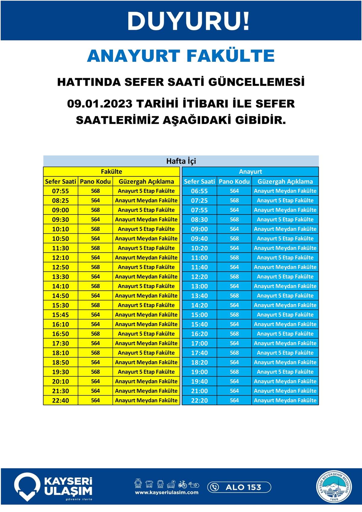 ANAYURT FAKÜLTE HATTINDA SEFER SAATİ GÜNCELLEMESİ 09.01.2023 TARİHİ İTİBARI İLE SEFER SAATLERİMİZ TABLODAKİ GİBİDİR.