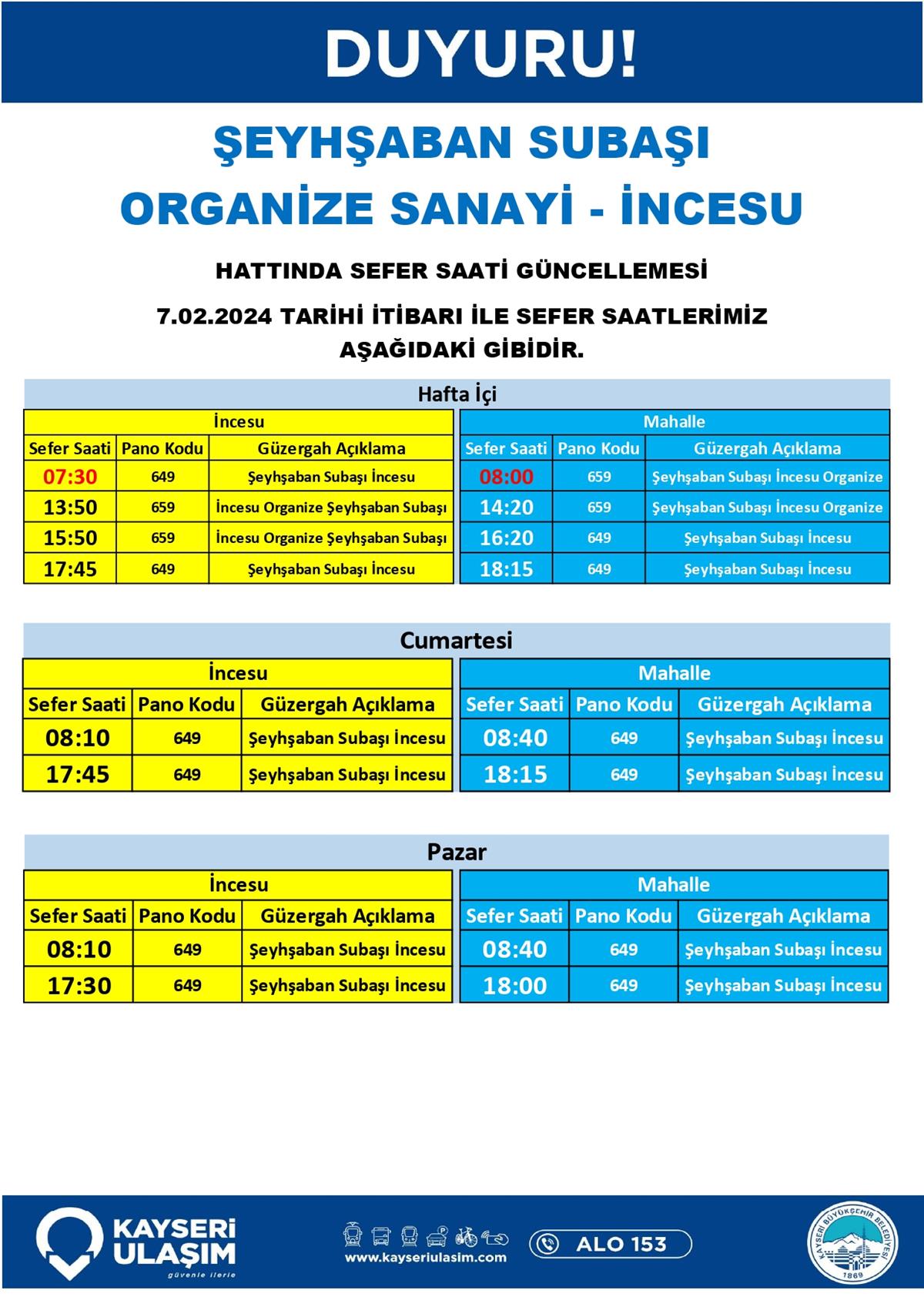 ŞEYHŞABAN SUBAŞI ORGANİZE SANAYİ - İNCESU HATTINDA SEFER SAATİ GÜNCELLEMESİ