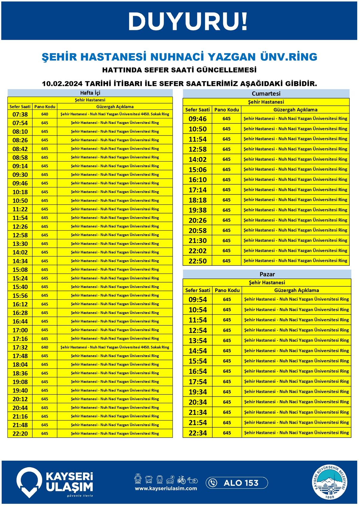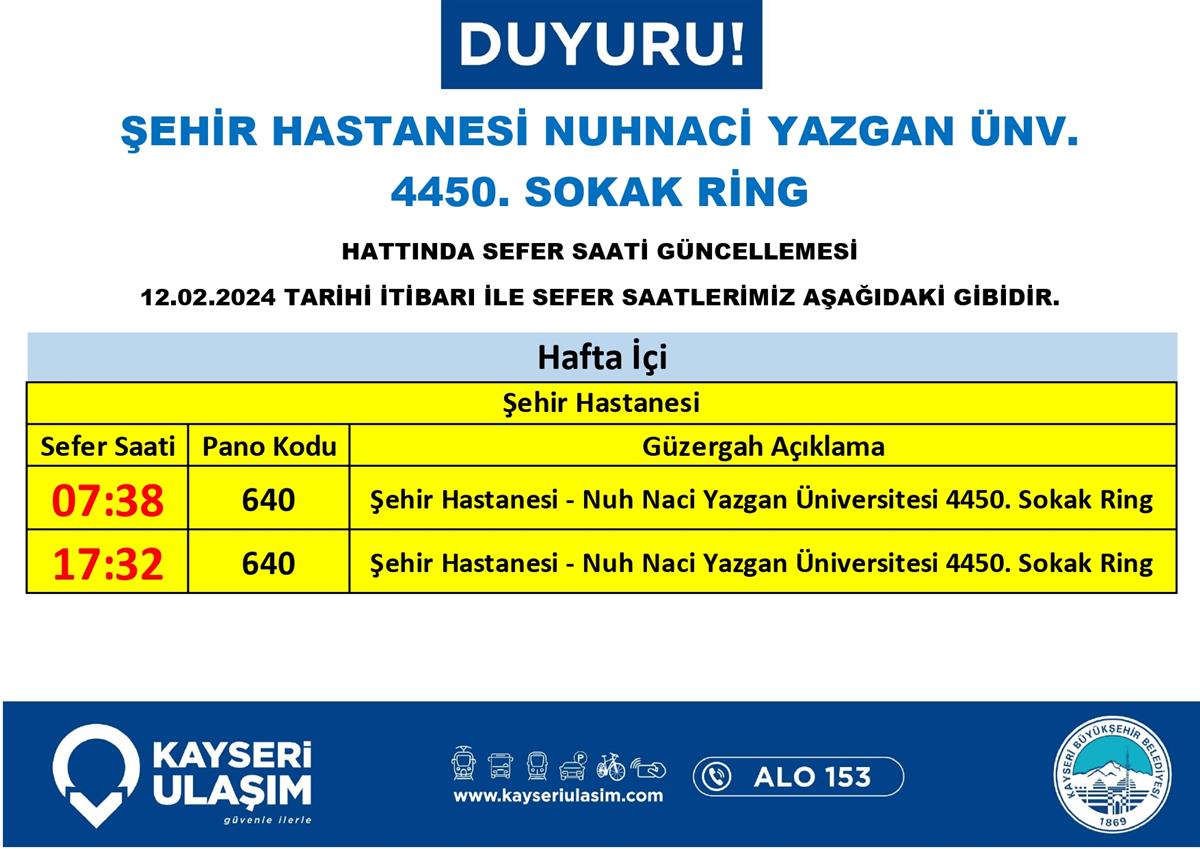 ŞEHİR HASTANESİ NUHNACİ YAZGAN ÜNV. 4450. SOKAK RİNG HATTINDA SEFER SAATİ GÜNCELLEMESİ