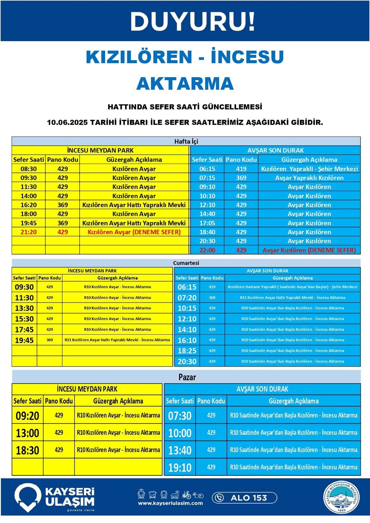 KIZILÖREN - İNCESU AKTARMA HATTINDA SEFER SAATİ GÜNCELLEMESİ