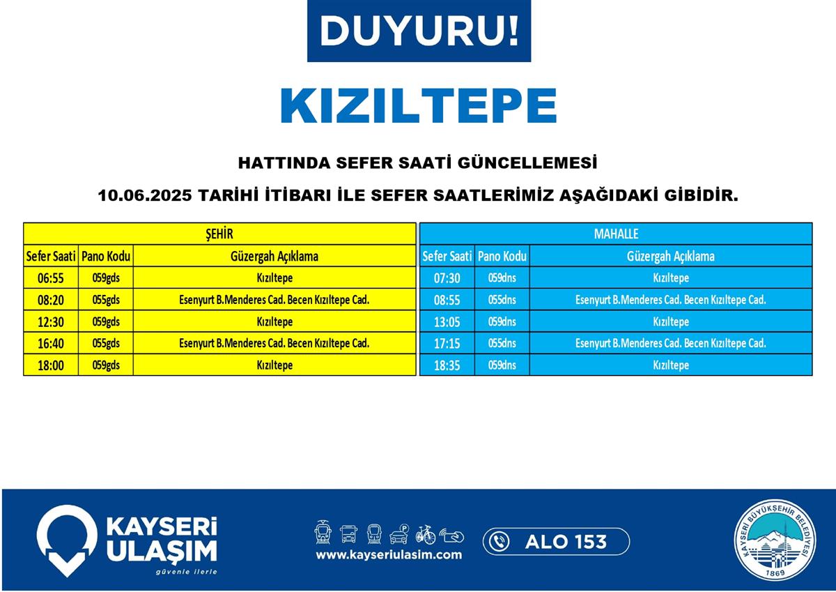 KIZILTEPE HATTINDA SEFER SAATİ GÜNCELLEMESİ