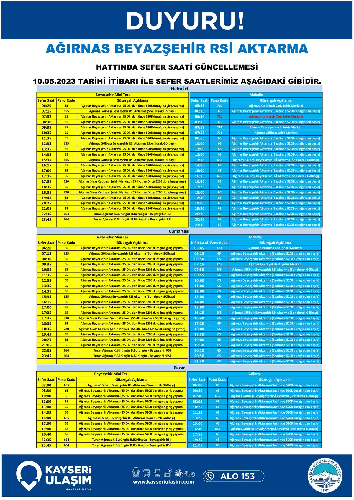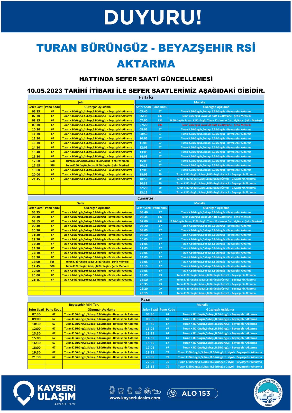 10 Mayıs 2023 Tarihinden İtibaren Bazı Sefer Saat Güncellemeleri Tablodaki Gibidir.