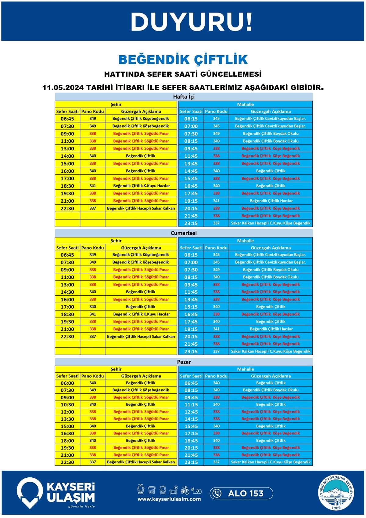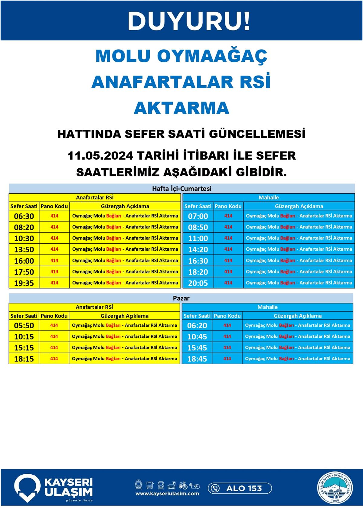 11 Mayıs 2024 Tarihinden itibaren Bazı Sefer Saat ve Güzergah Güncellemeleri Yapılmıştır.