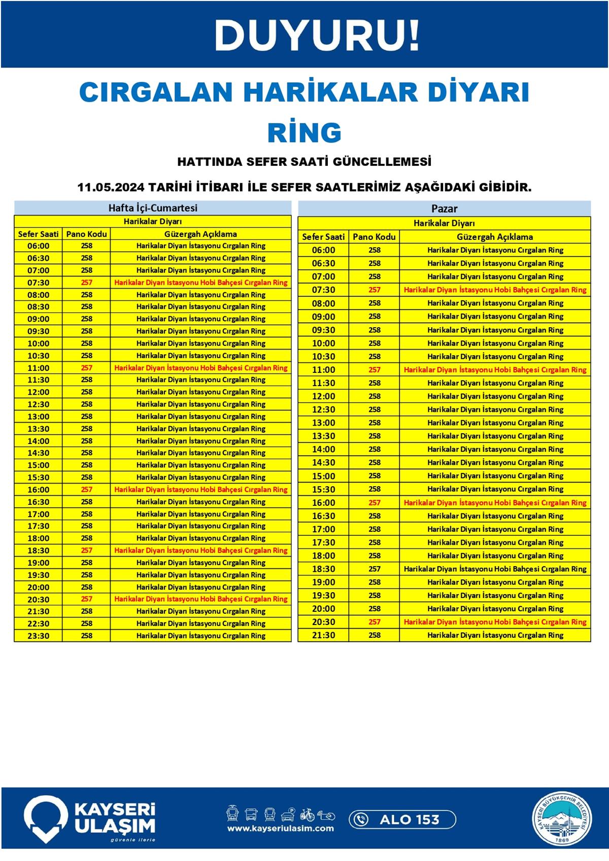 CIRGALAN HARİKALAR DİYARI RİNG HATTINDA SEFER SAATİ GÜNCELLEMESİ