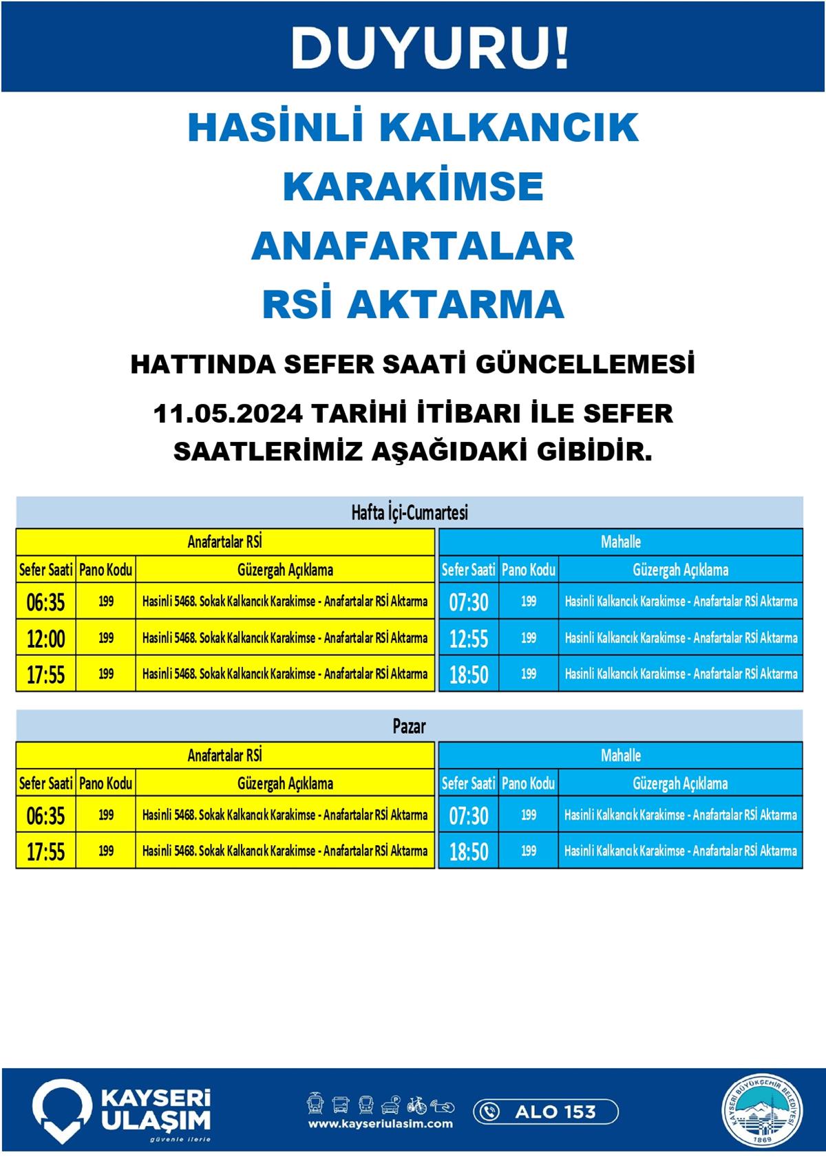 HASİNLİ KALKANCIK KARAKİMSE ANAFARTALAR RSİ AKTARMA HATTINDA SEFER SAATİ GÜNCELLEMESİ