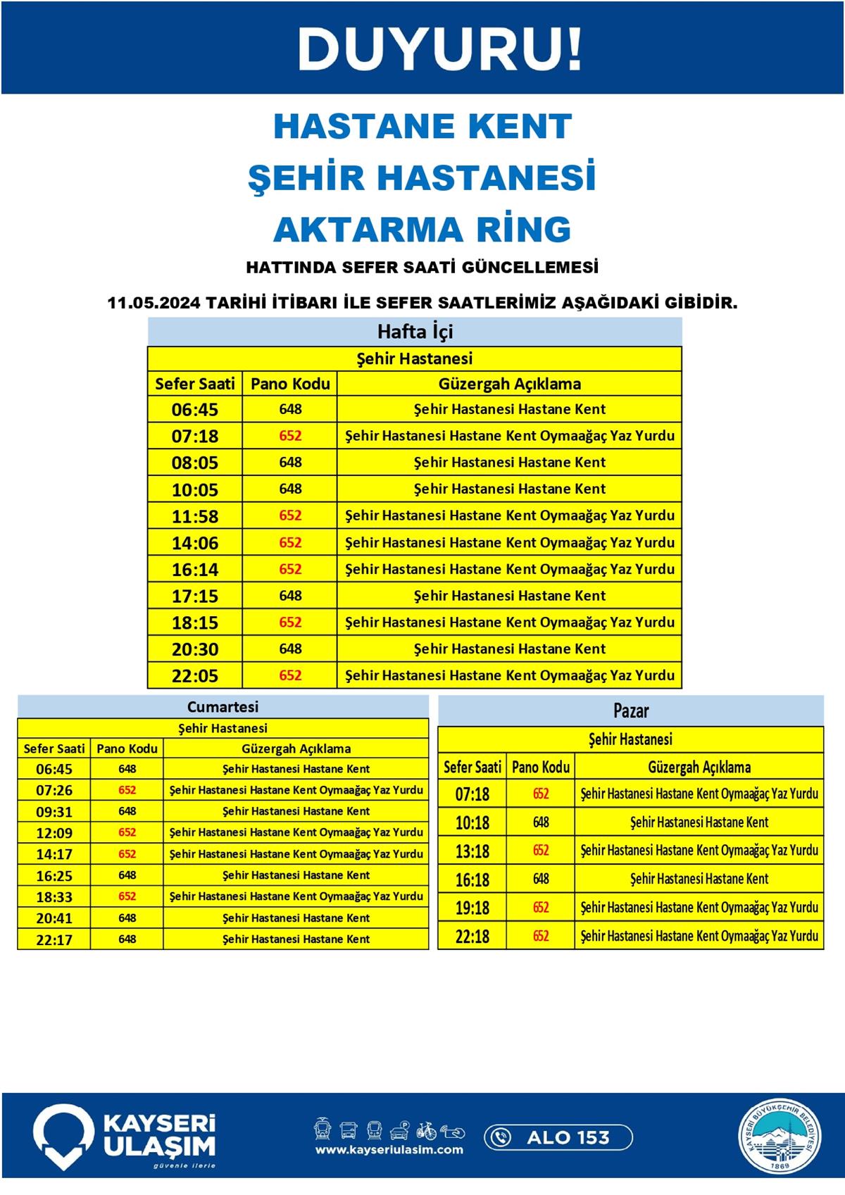 HASTANE KENT ŞEHİR HASTANESİ AKTARMA RİNG HATTINDA SEFER SAATİ GÜNCELLEMES