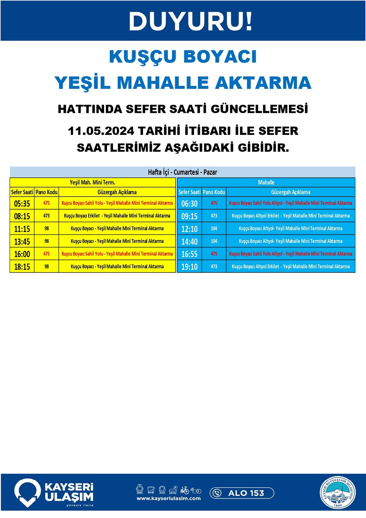 KUŞÇU BOYACI YEŞİL MAHALLE AKTARMA HATTINDA SEFER SAATİ GÜNCELLEMESİ