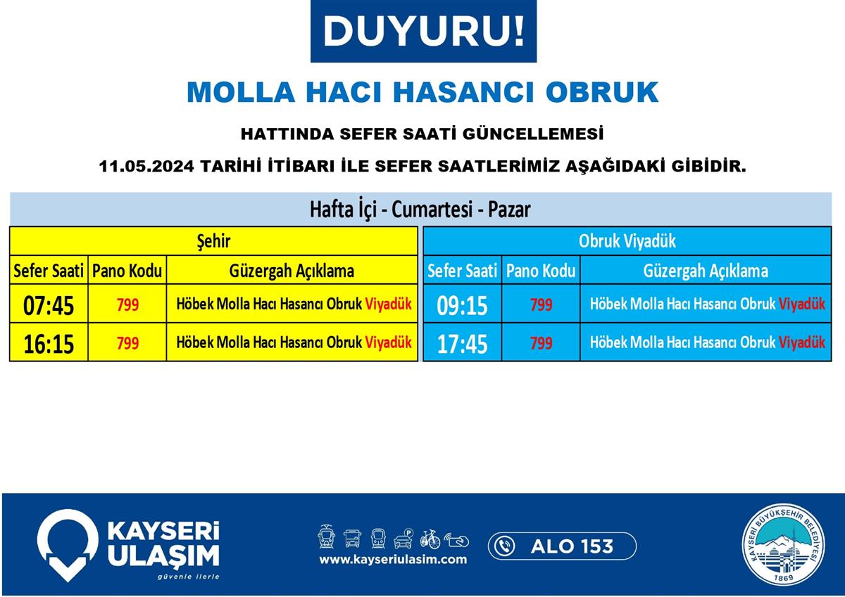 MOLLA HACI HASANCI OBRUK HATTINDA SEFER SAATİ GÜNCELLEMESİ