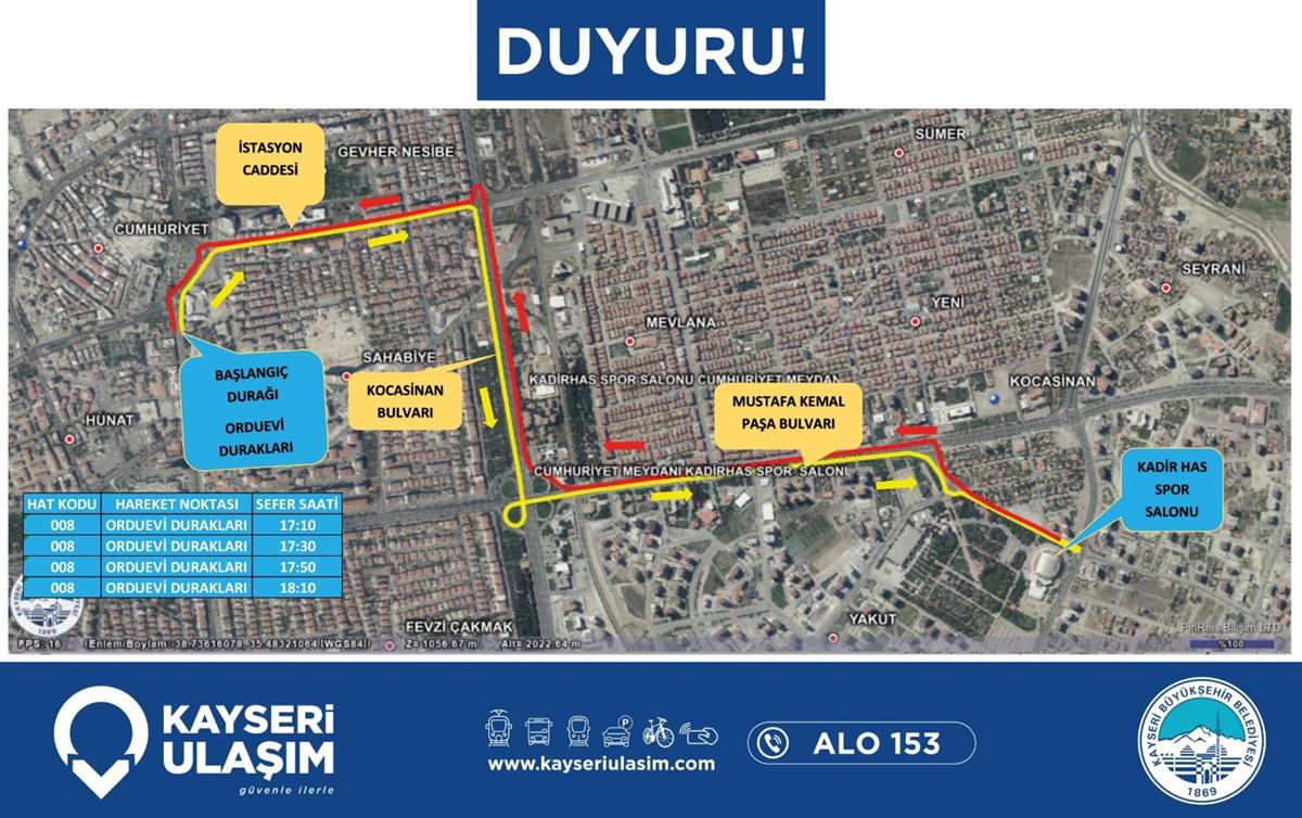 11 Ocak 2024 Tarihinde Melikgazi Kayseri basketbol takımı ile NKA Universıtas Pecs takımı arasında oynanacak basketbol müsabakası için Cumhuriyet meydanı 6 nolu Sivas bulvarı Ordu evi 9 nolu duraktan hareket edecek Kadir Has Spor salonu sefer saat ve güzergah planlanması