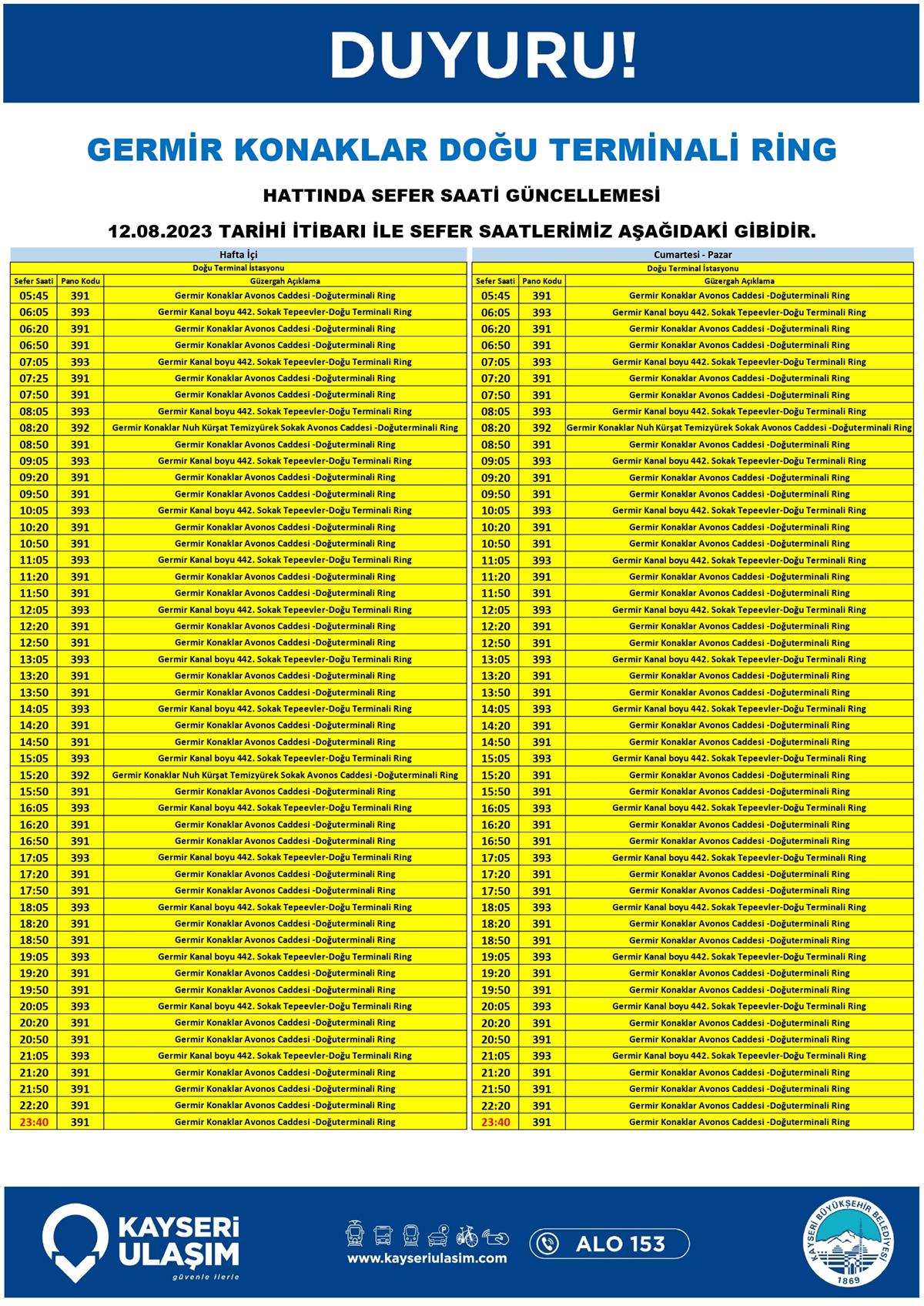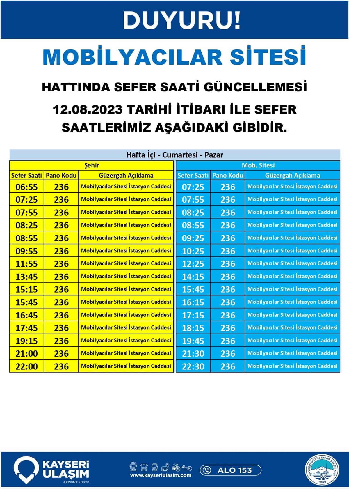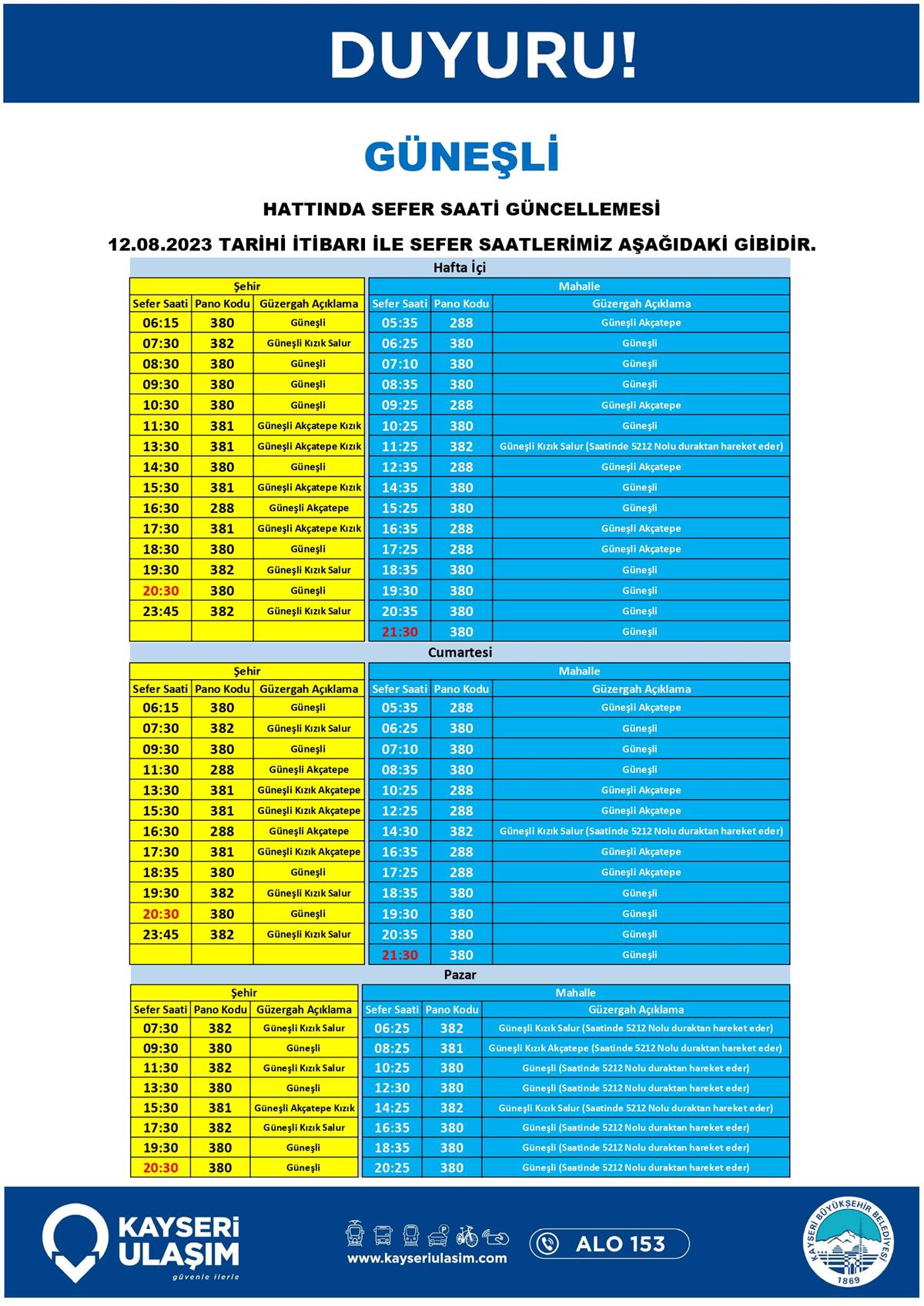 12 Ağustos 2023 Tarihinden İtibaren Bazı Sefer Saat ve Hat Güncellemeleri Yapılmıştır.
