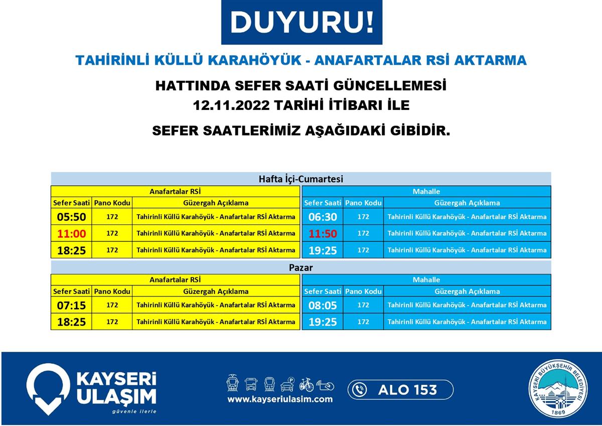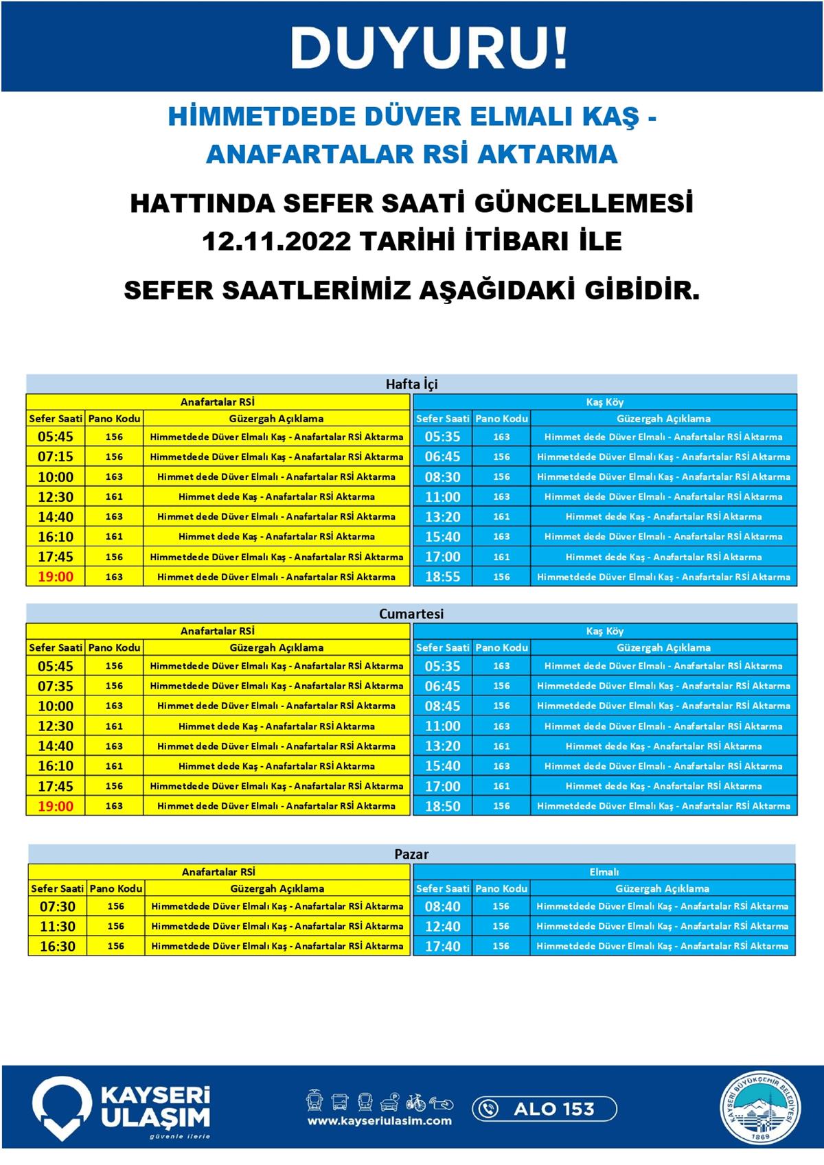 Sayın yolcularımız, 12.11.2022 tarihi itibariyle "Tahirinli-Küllü-Karahöyük" ve "Himmetdede-Düver-Elmalı-Kaş" sefer saat güncellemeleri ile 460-461 Erenköy hattı güzergahlarında güncelleme yapılmıştır. İyi yolculuklar dileriz...