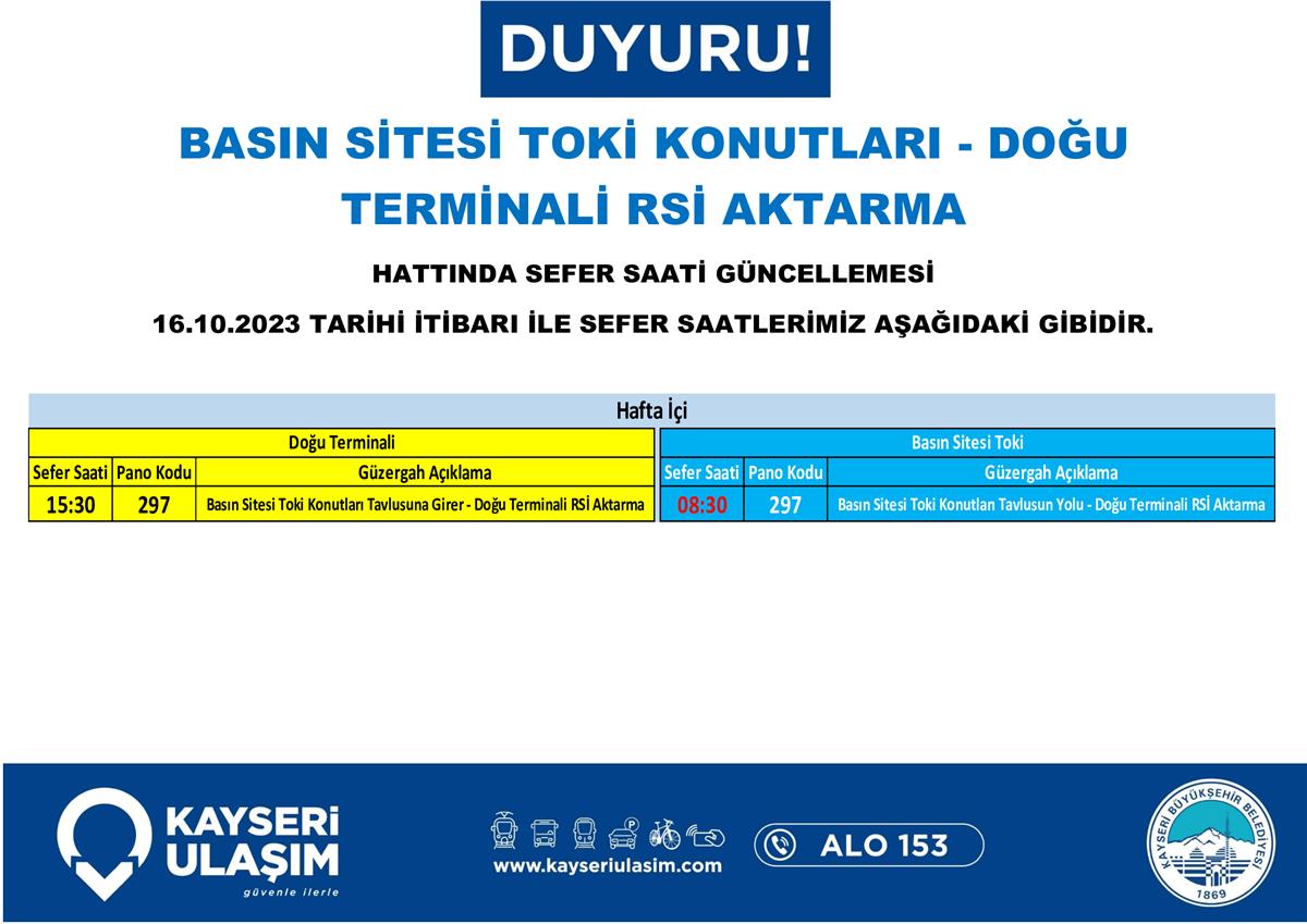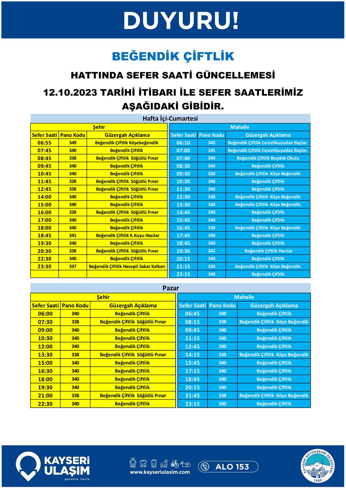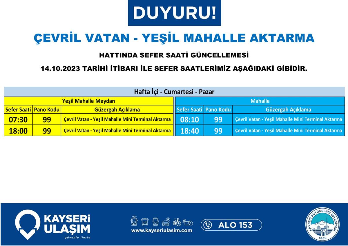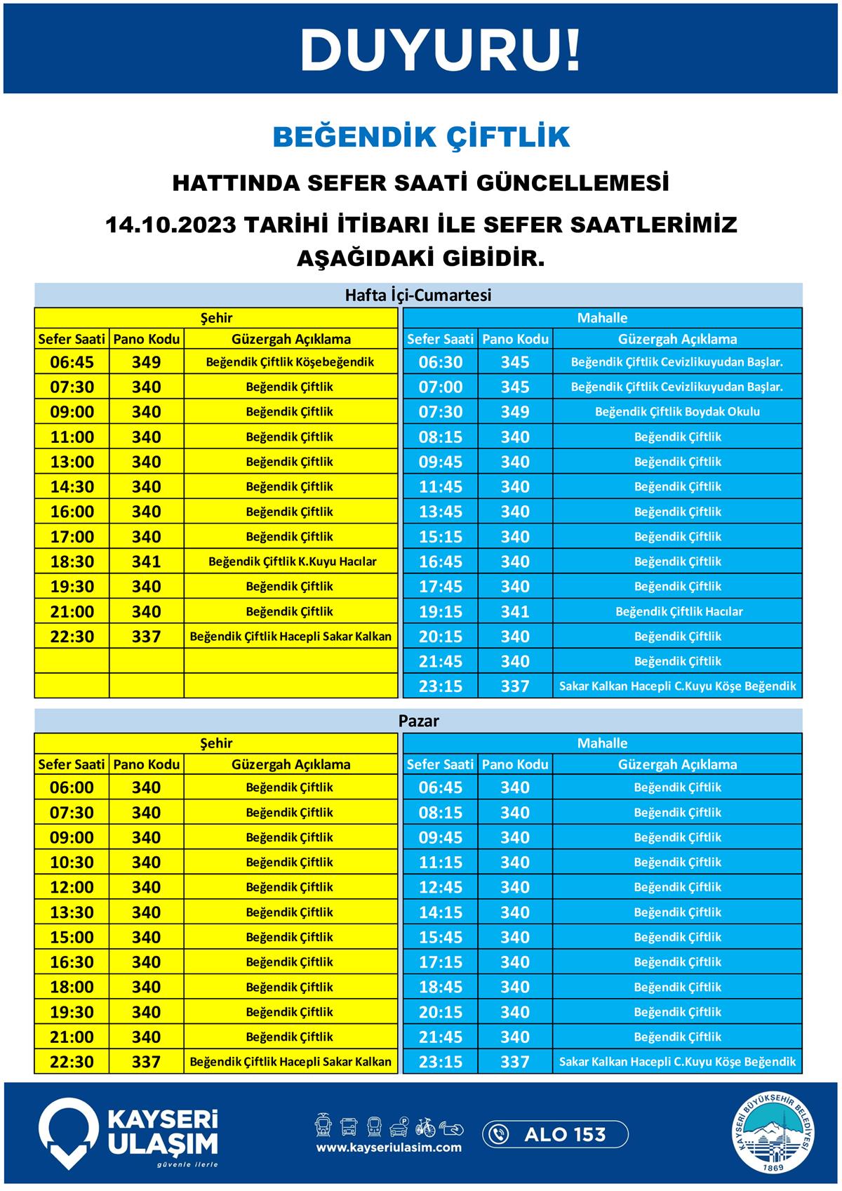 14 – 16 Ekim 2023 Tarihleri Arasında Bazı Sefer Saat ve Güzergah Güncellemeleri Yapılmıştır.