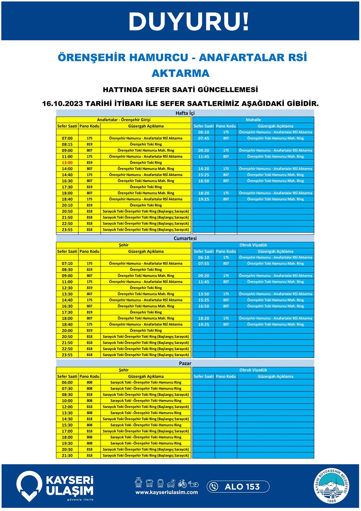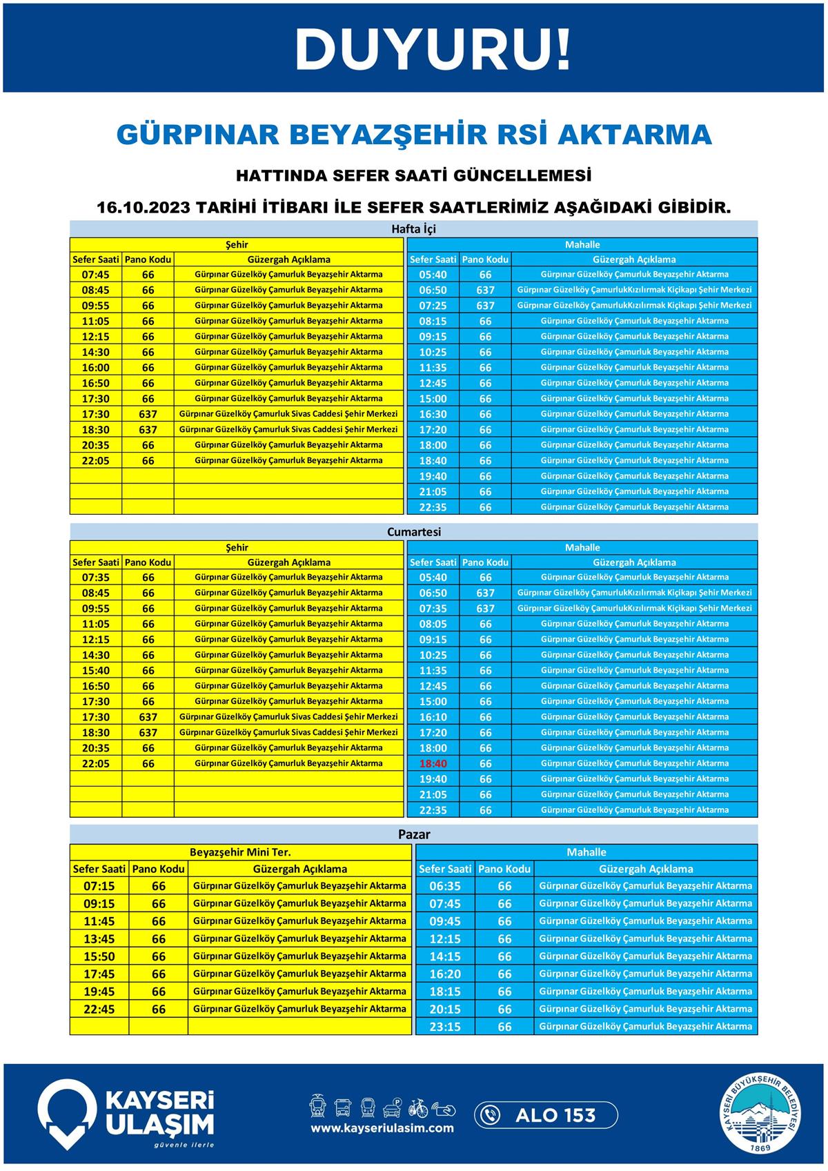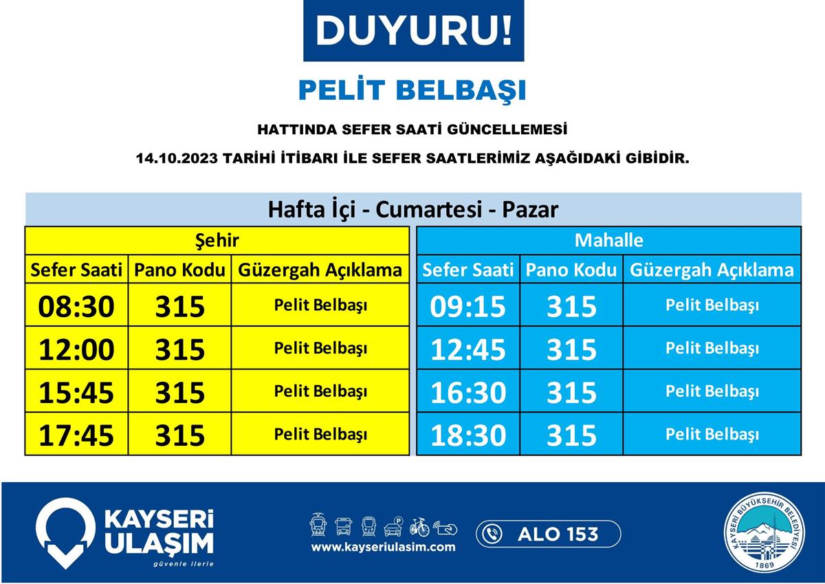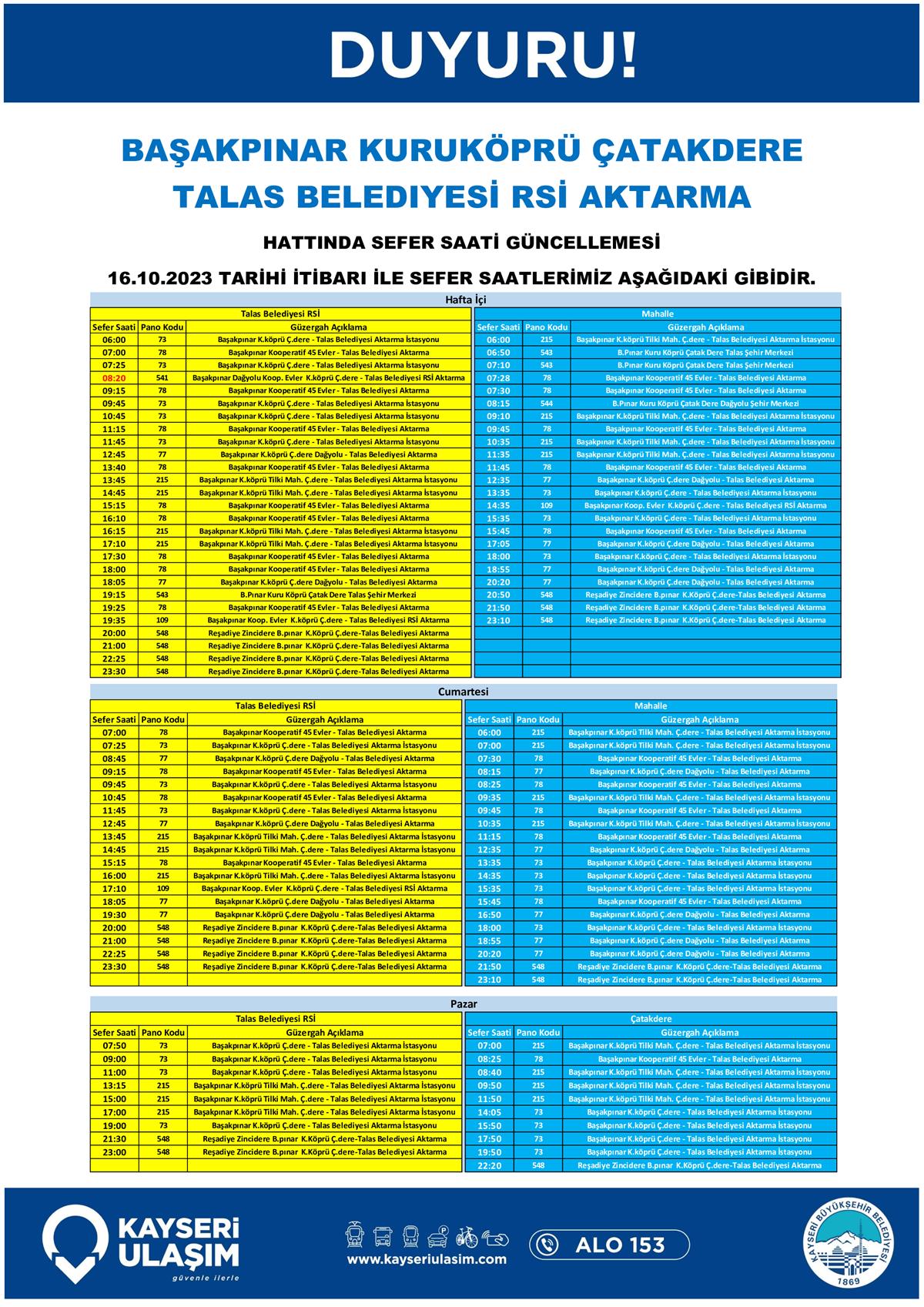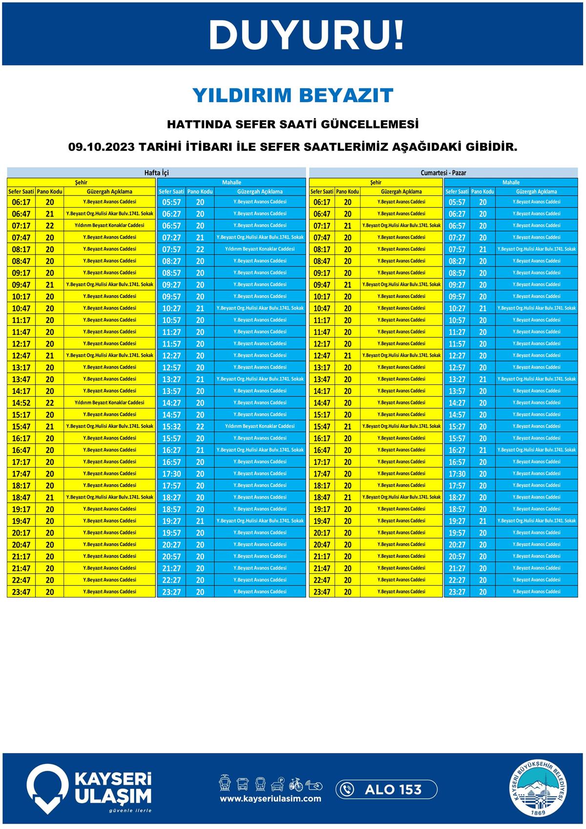14 – 16 Ekim 2023 Tarihleri Arasında Bazı Sefer Saat ve Güzergah Güncellemeleri Yapılmıştır.