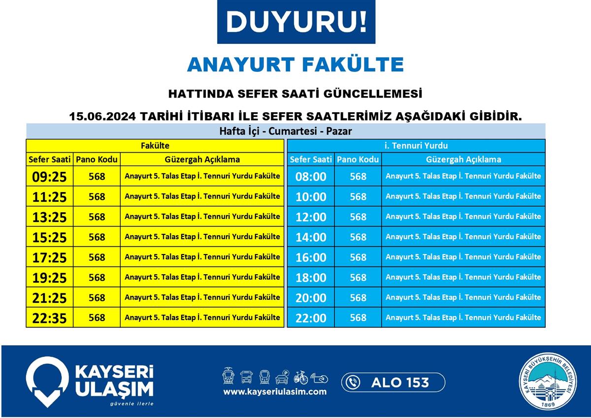 ANAYURT FAKÜLTE HATTINDA SEFER SAATİ GÜNCELLEMESİ