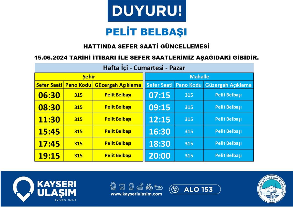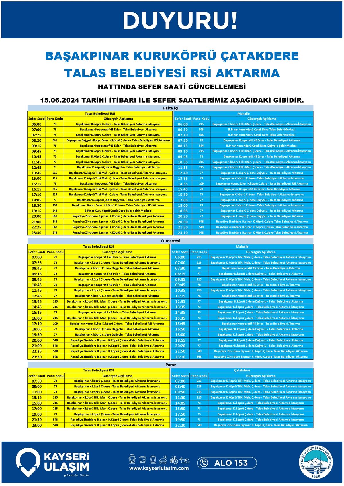 BAŞAKPINAR KURUKÖPRÜ ÇATAKDERE TALAS BELEDİYESİ RSİ AKTARMA HATTINDA SEFER SAATİ GÜNCELLEMESİ