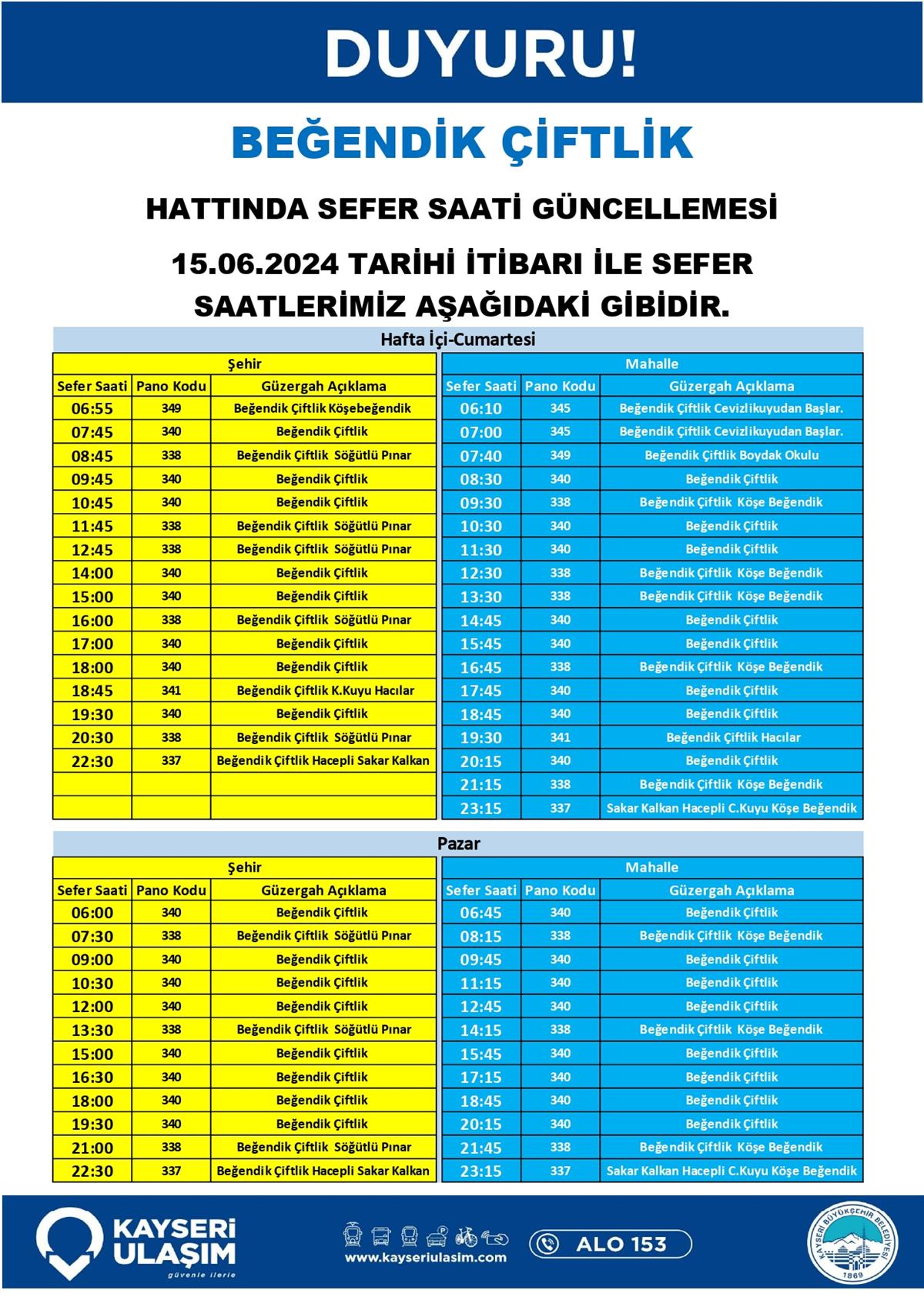 BEĞENDİK ÇİFTLİK HATTINDA SEFER SAATİ GÜNCELLEMESİ
