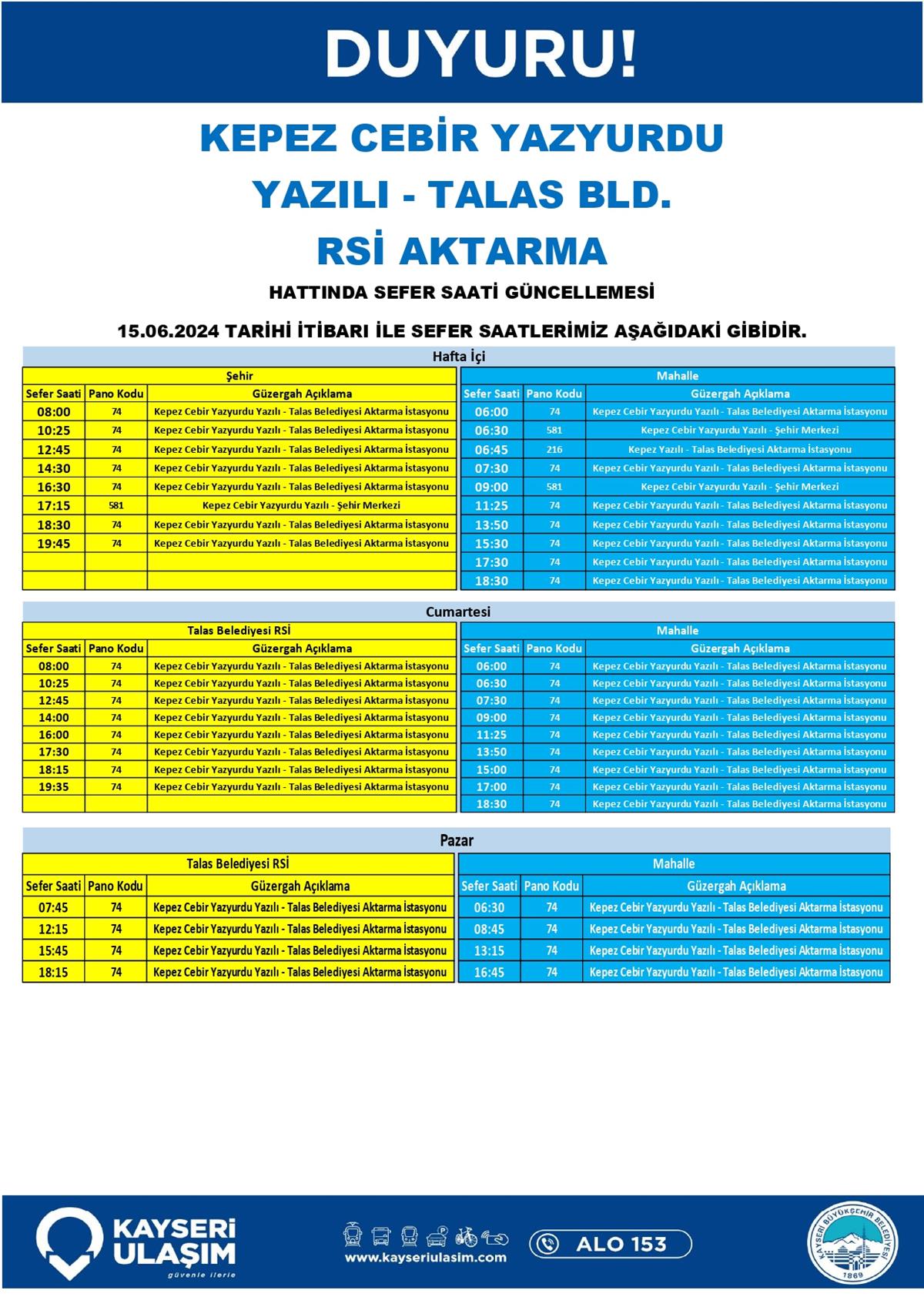 KEPEZ CEBİR YAZYURDU YAZILI - TALAS BLD. RSİ AKTARMA HATTINDA SEFER SAATİ GÜNCELLEMESİ