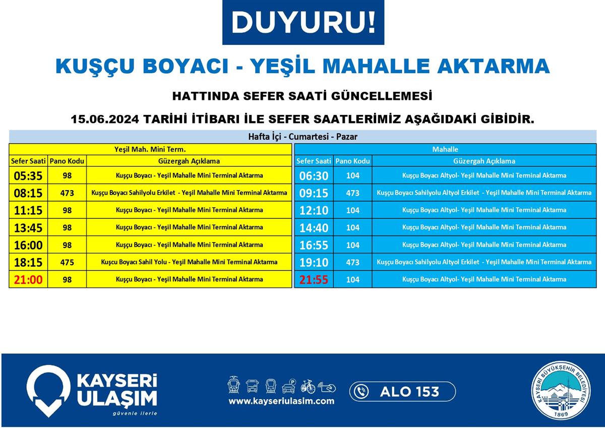 KUŞÇU BOYACI - YEŞİL MAHALLE AKTARMA HATTINDA SEFER SAATİ GÜNCELLEMESİ