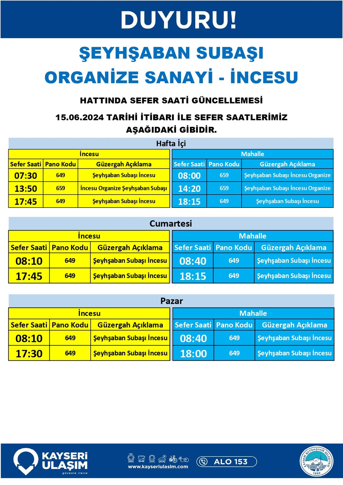 ŞEYHŞABAN SUBAŞI ORGANİZE SANAYİ - İNCESU HATTINDA SEFER SAATİ GÜNCELLEMESİ