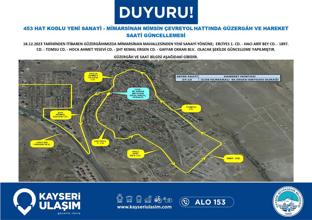 453 HAT KODLU YENİ SANAYİ - MİMARSİNAN MİMSİN ÇEVREYOL HATTINDA GÜZERGÂH VE HAREKET SAATİ GÜNCELLEMESİ