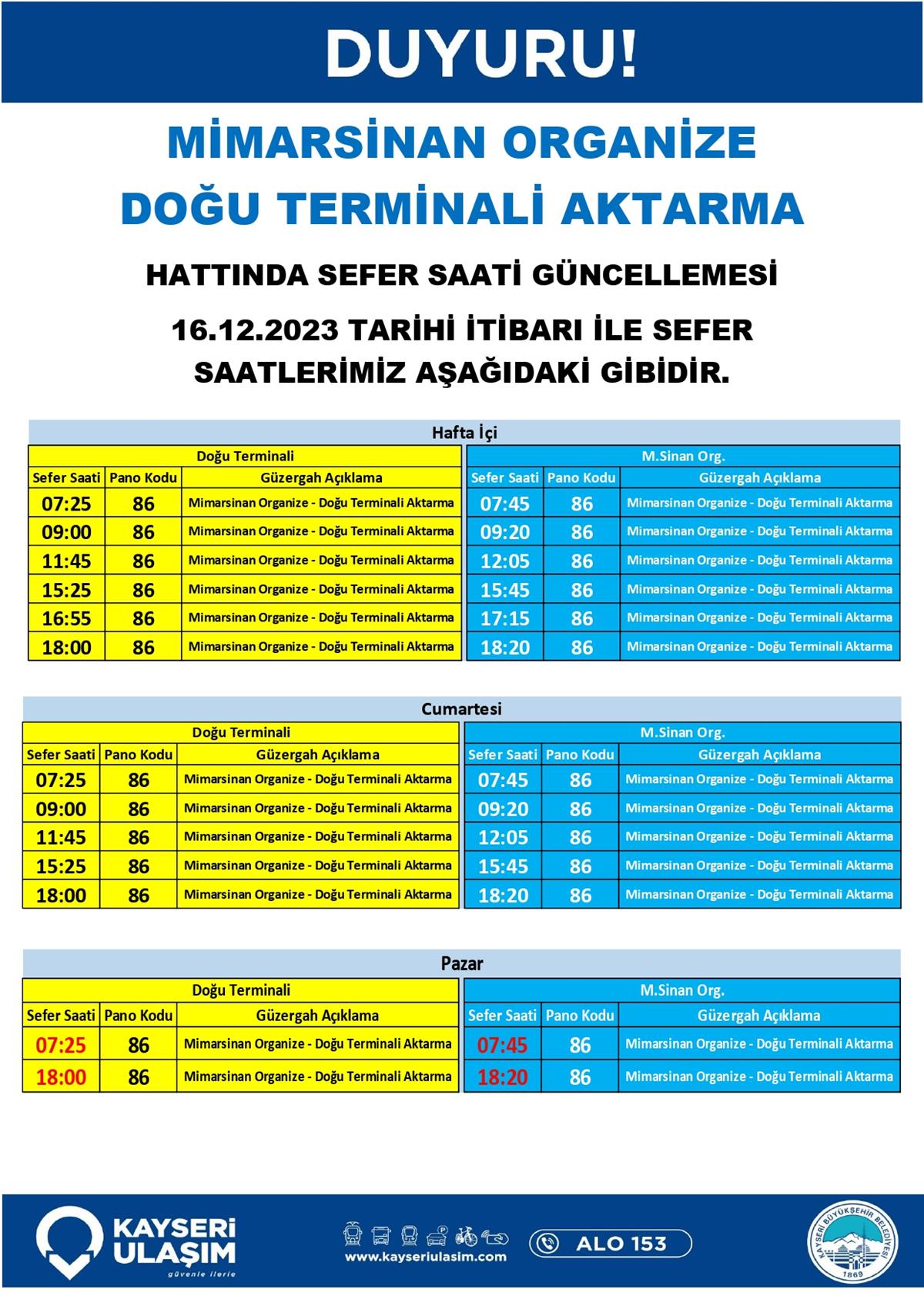 MİMARSİNAN ORGANİZE DOĞU TERMİNALİ AKTARMA HATTINDA SEFER SAATİ GÜNCELLEMESİ