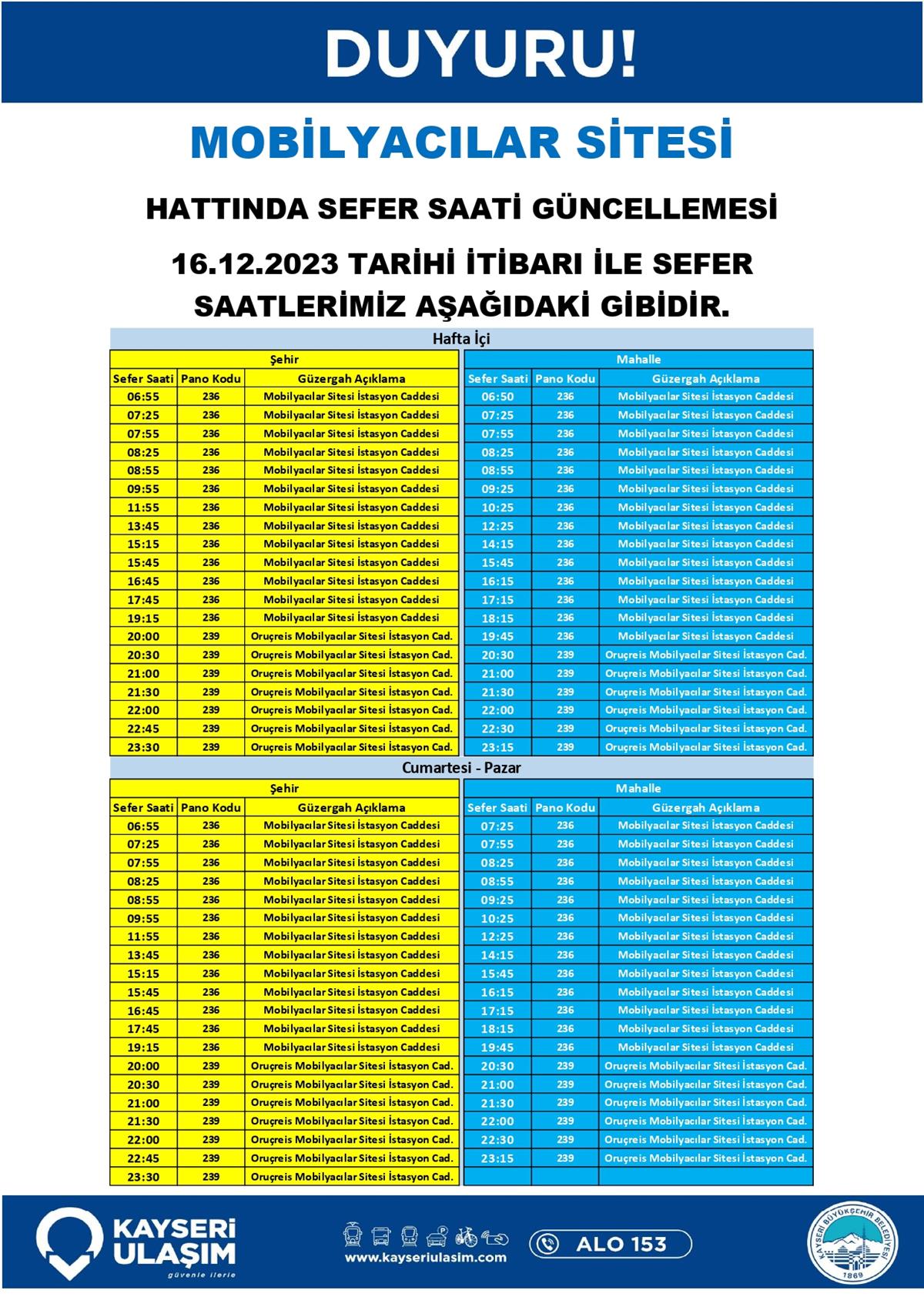 MOBİLYACILAR SİTESİ HATTINDA SEFER SAATİ GÜNCELLEMESİ