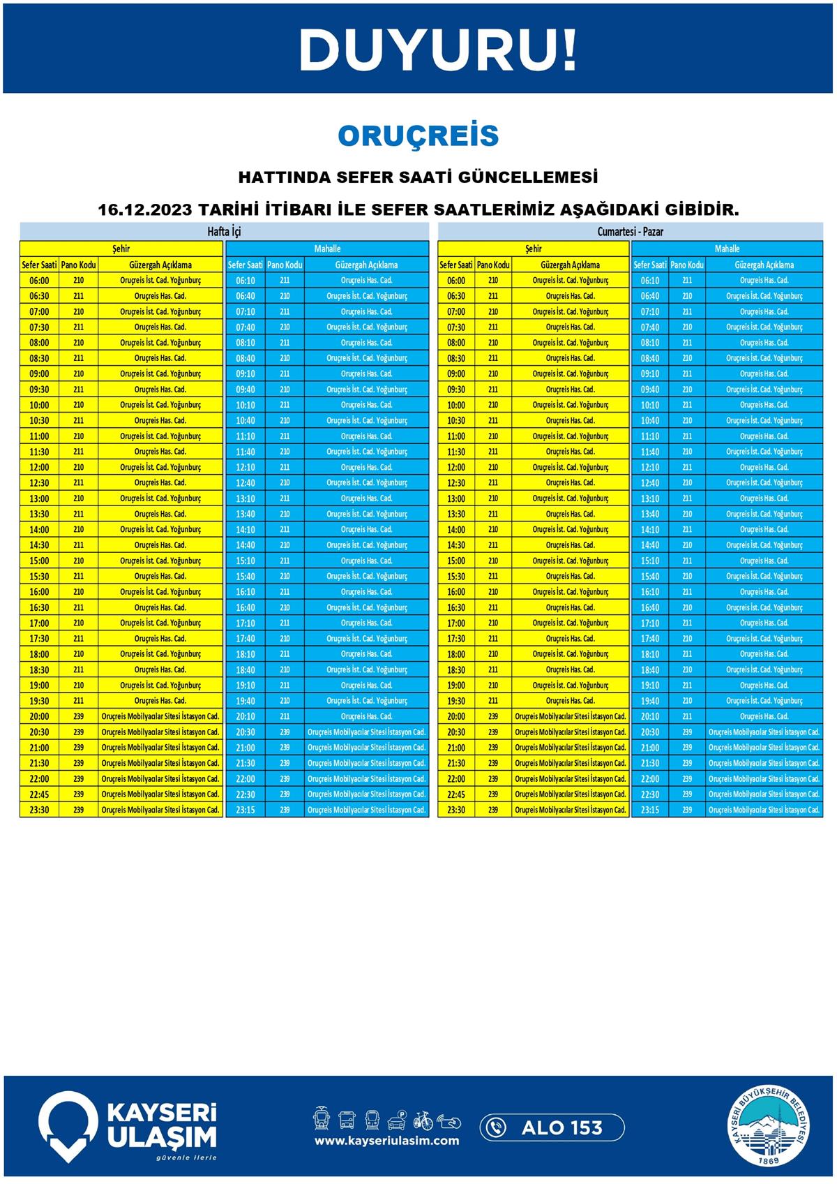ORUÇREİS HATTINDA SEFER SAATİ GÜNCELLEMESİ