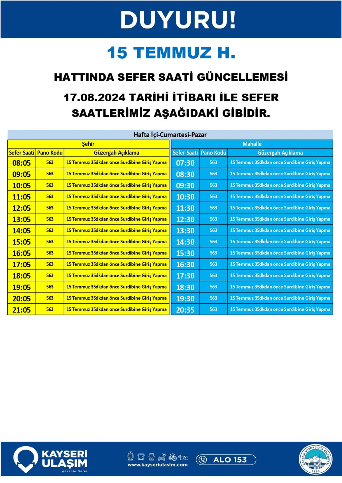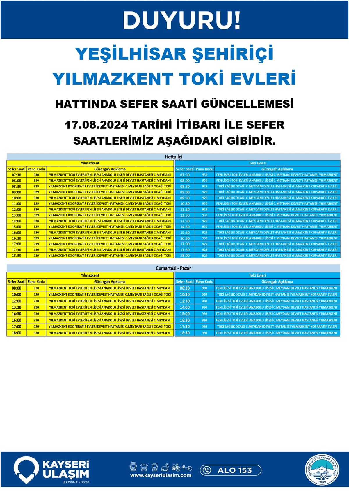 17 Ağustos 2024 Tarihinde Bazı Sefer Saat ve Güzergah Güncellemeleri Yapılmıştır