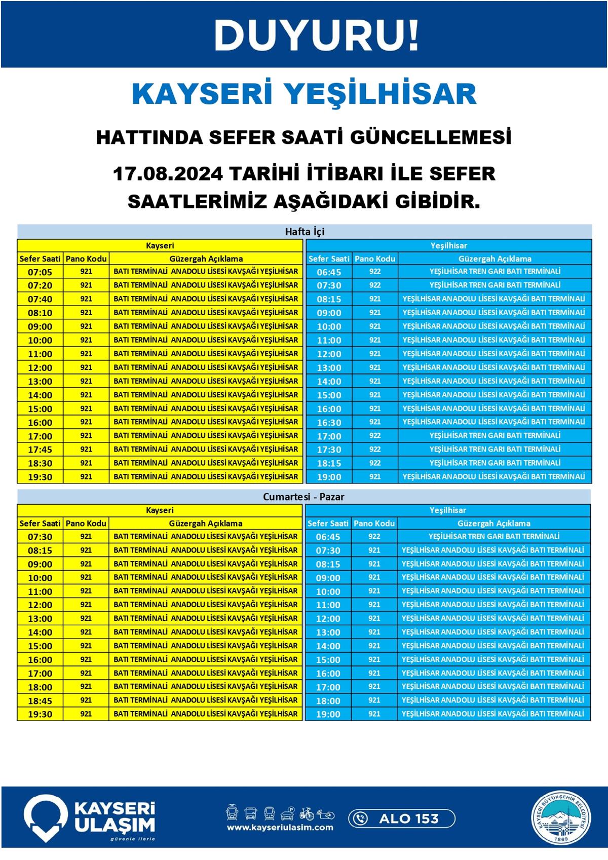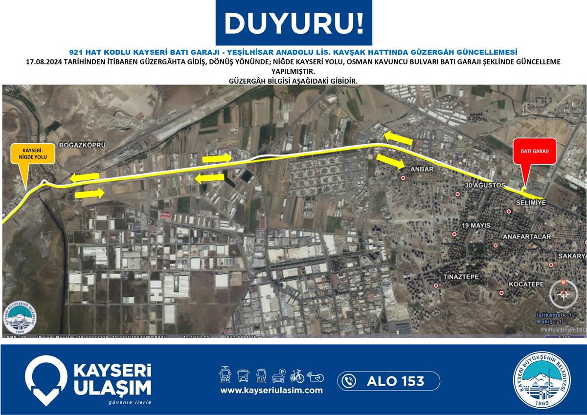 921 HAT KODLU KAYSERİ BATI GARAJI - YEŞİLHİSAR ANADOLU LİS. KAVŞAK HATTINDA GÜZERGÂH GÜNCELLEMESİ