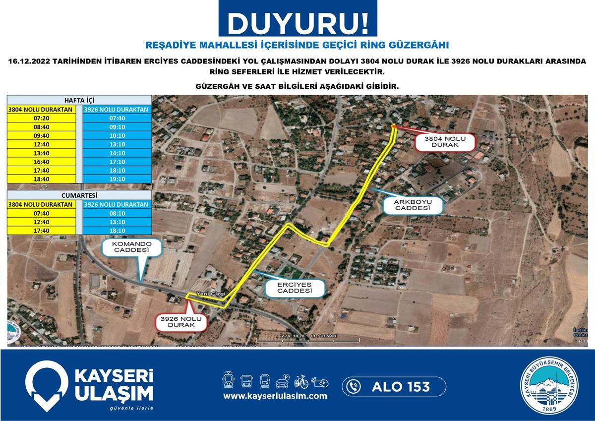 AYRICA REŞADİYE MAHALLLESİ İÇERİSİNDE YOL ÇAIŞMASINDAN DOLAYI GEÇİCİ RİNG GÜZERGAHI TABLODAKİ GİBİDİR.