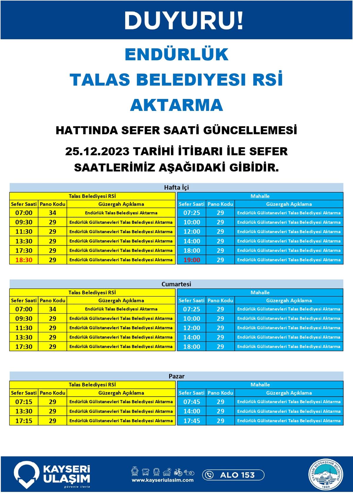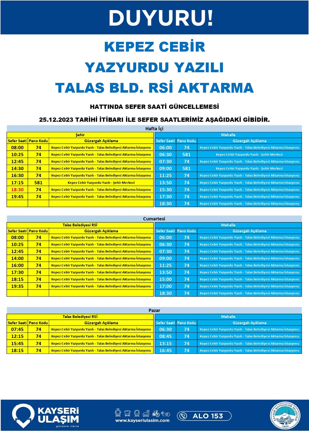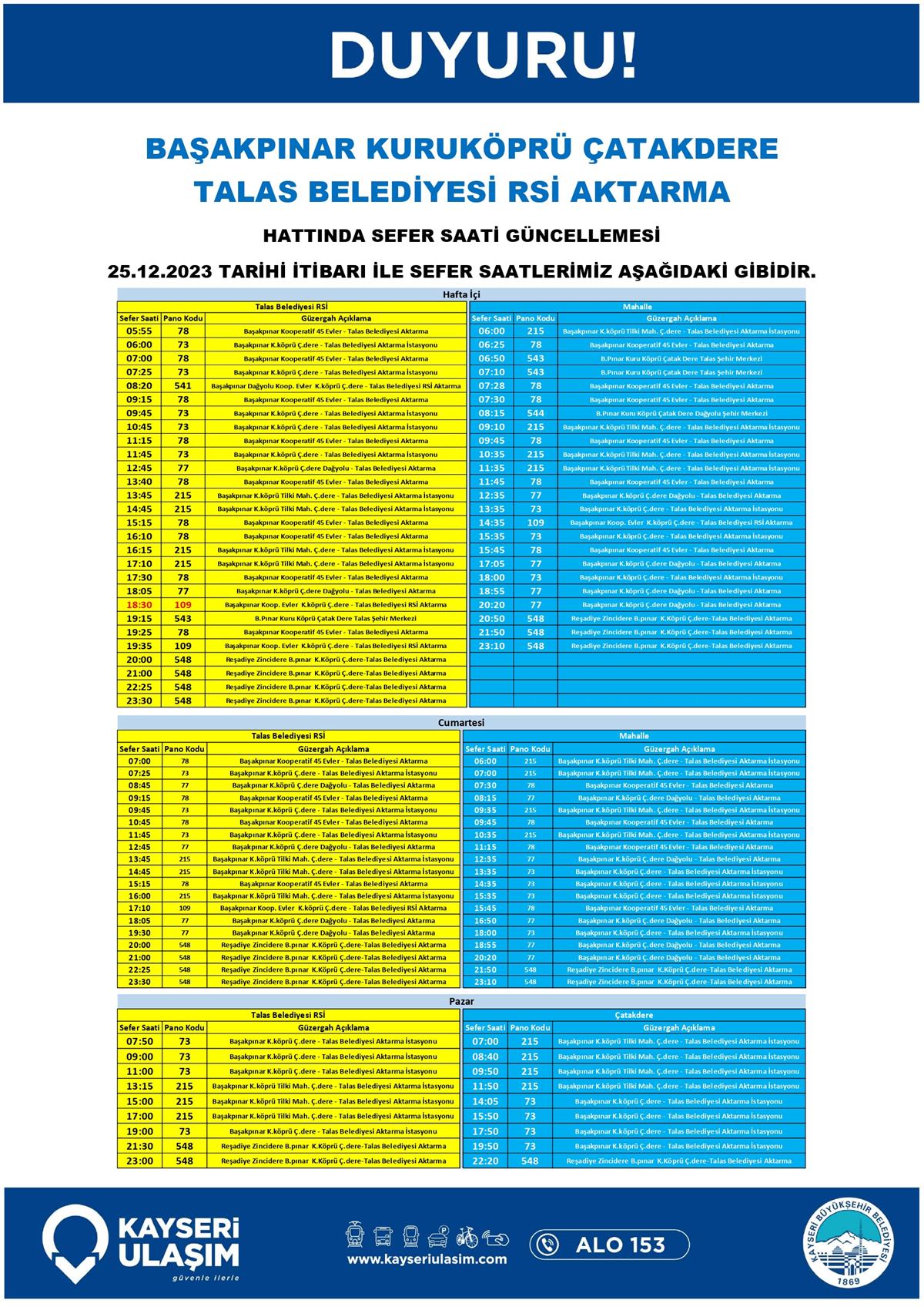 19-25 Aralık 2023 Tarihinden İtibaren Bazı Sefer Saat ve Güzergah Güncellemeleri Yapılmıştır.
