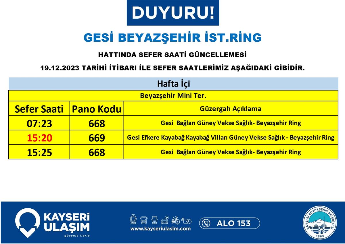 GESİ BEYAZŞEHİR İST.RİNG HATTINDA SEFER SAATİ GÜNCELLEMES