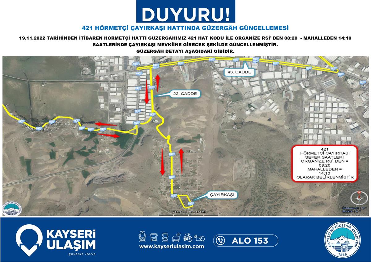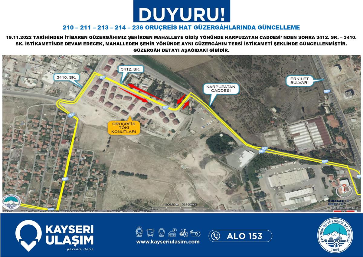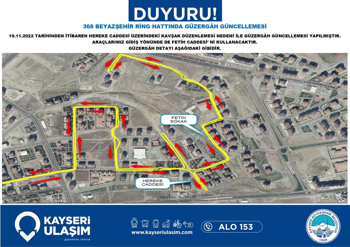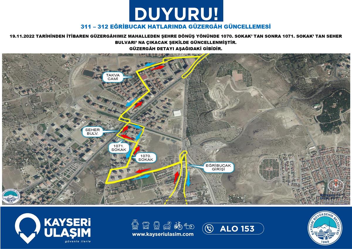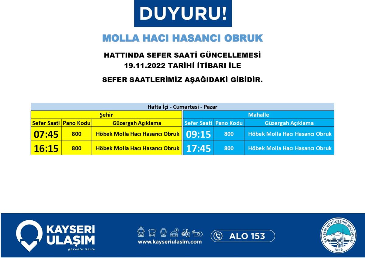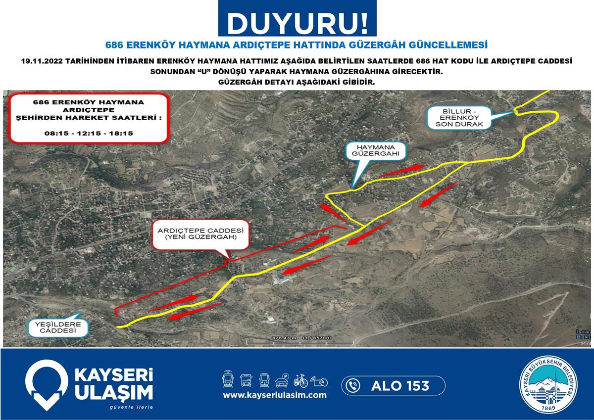 Sayın yolcularımız, 19.11.2022 tarihi itibariyle "MOLLA HACI HASANCI OBRUK, 311 - 312 EĞRİBUCAK, 686 ERENKÖY HAYMANA ARDIÇTEPE, ORUÇREİS, 421 HÖRMETÇİ ÇAYIRKAŞI, 398 BEYAZŞEHİR RİNG'' hattı güzergahları ve saatlerinde güncelleme yapılmıştır. İyi yolculuklar dileriz...