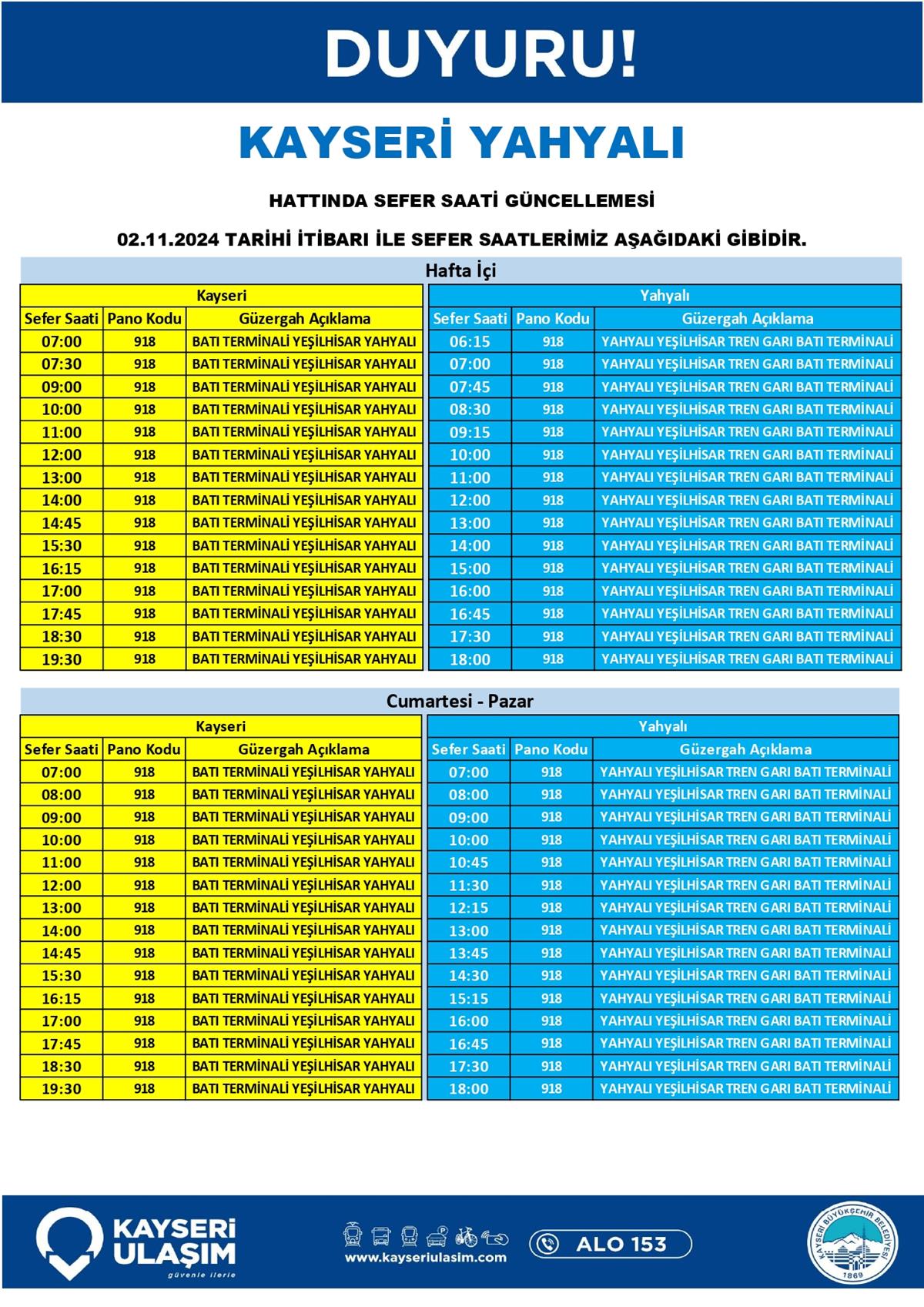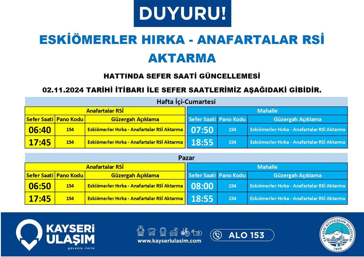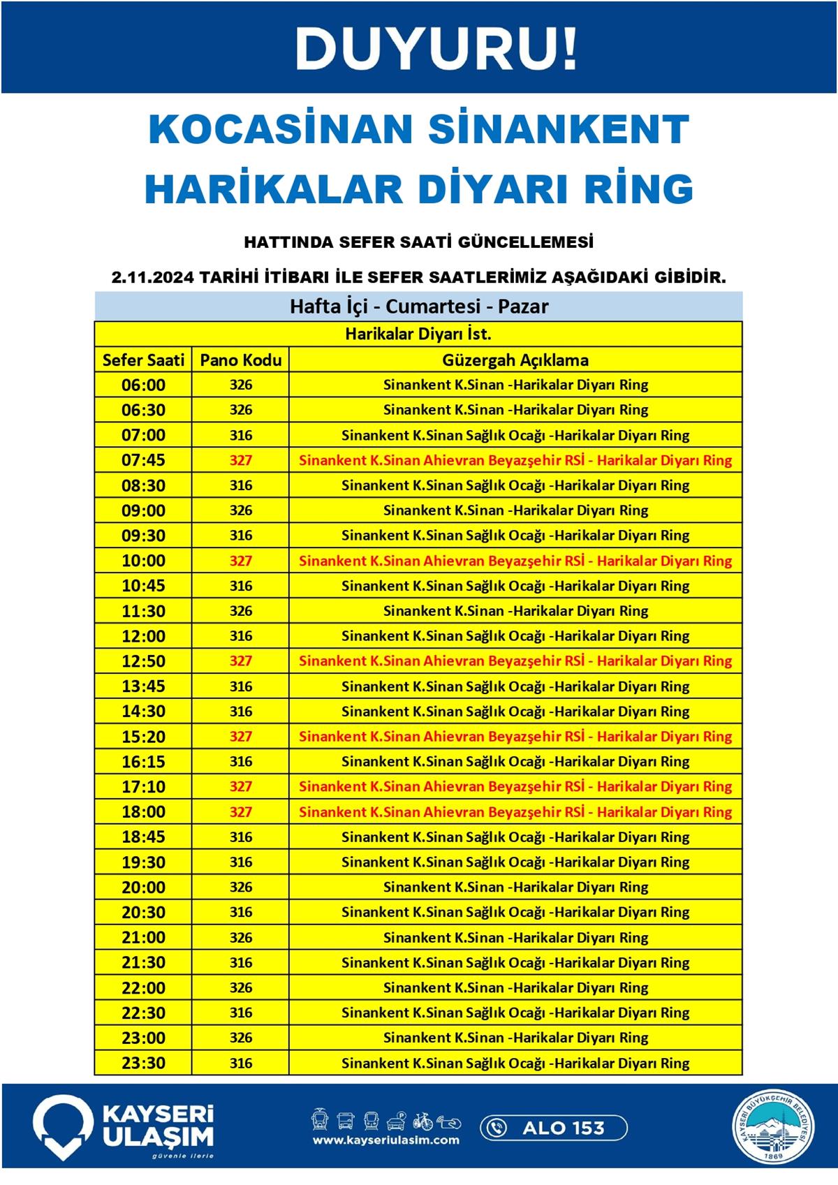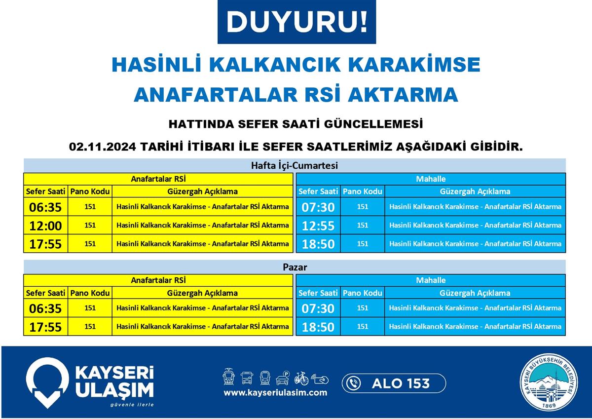 2 Kasım 2024 Tarihinden İtibaren Sefer Saat ve Güzergah Güncellemeleri Yapılmıştır.