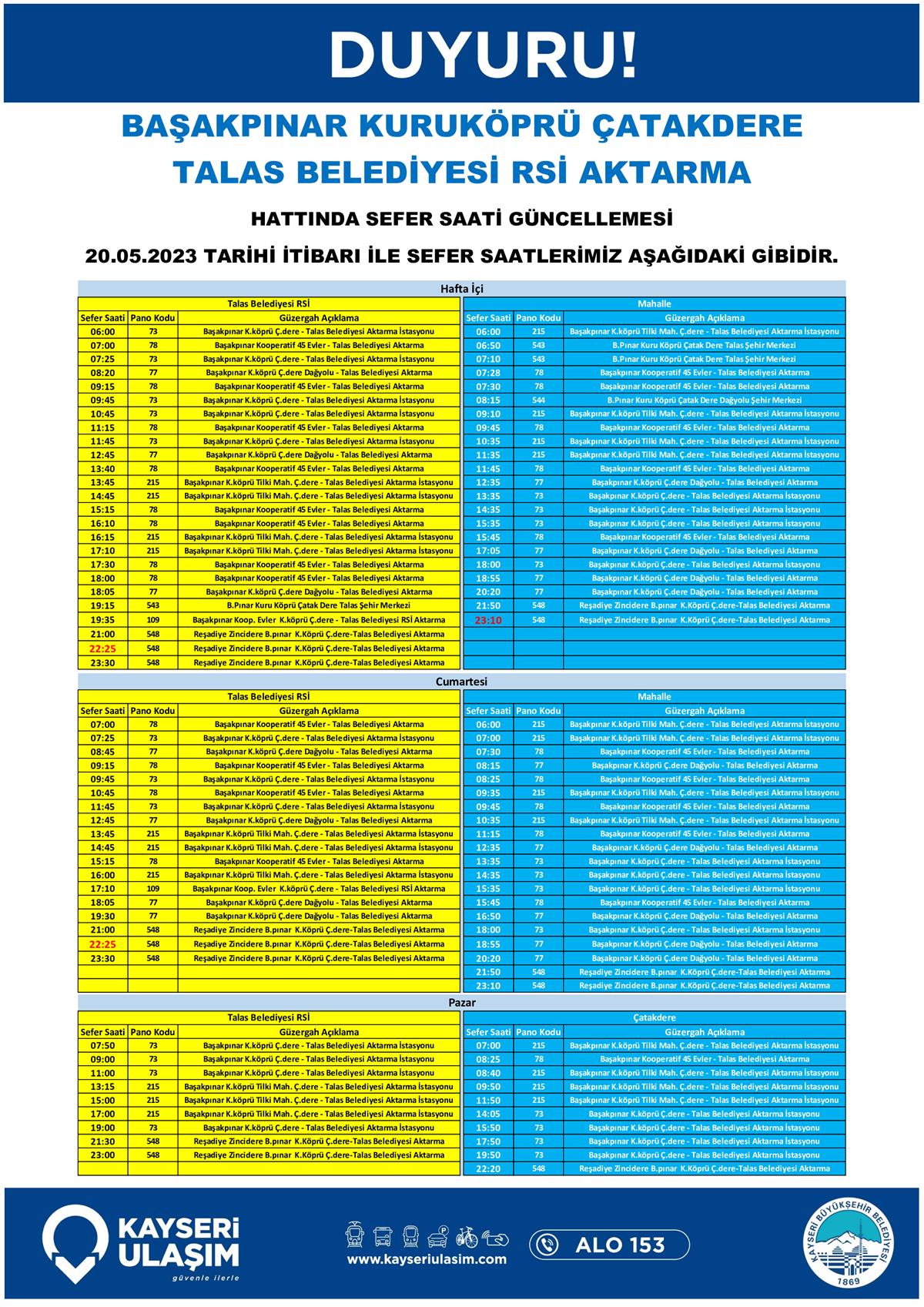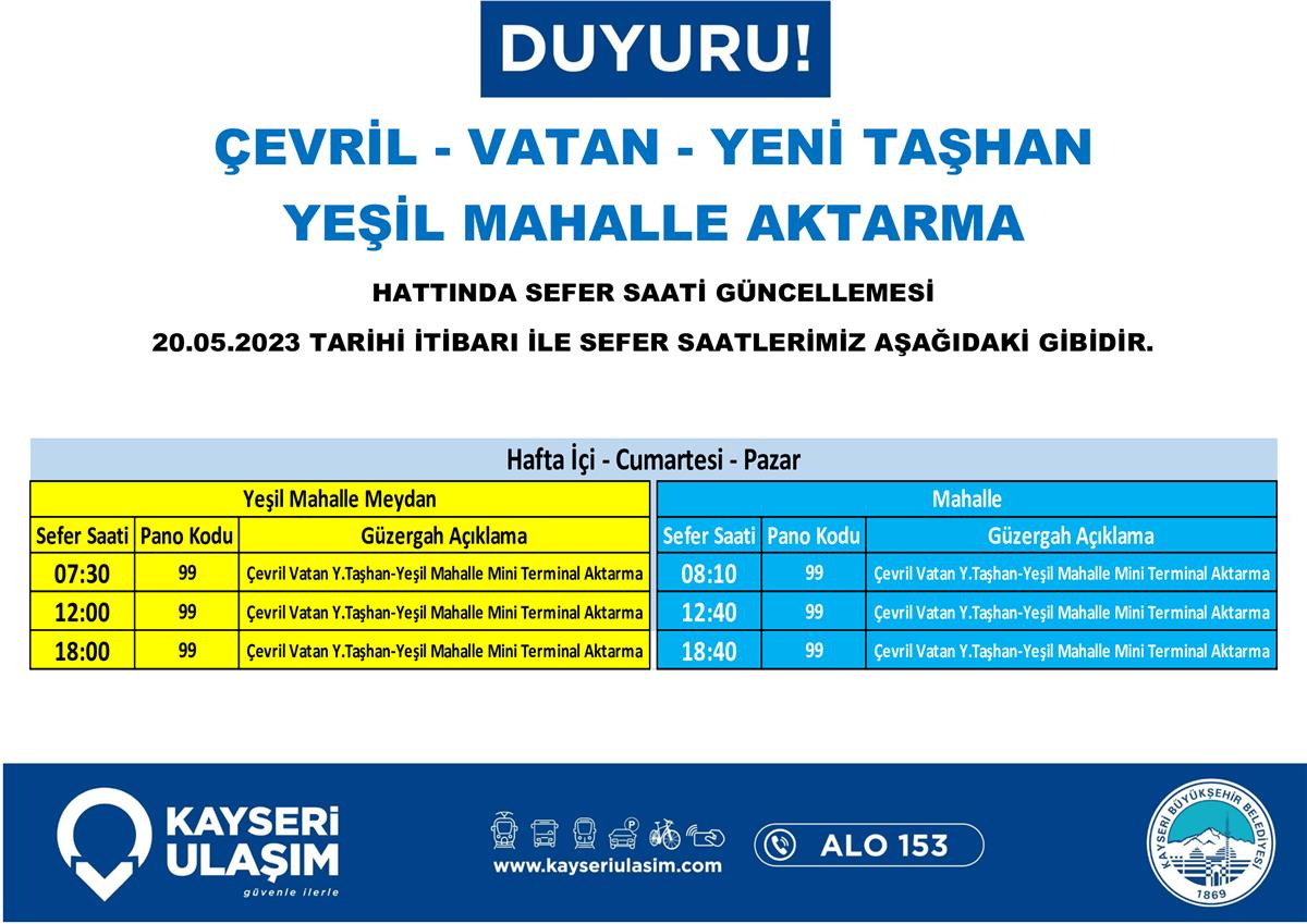 20 Mayıs 2023 Tarihinden İtibaren Bazı Sefer Saat Güncellemeleri Tablodaki Gibidir.