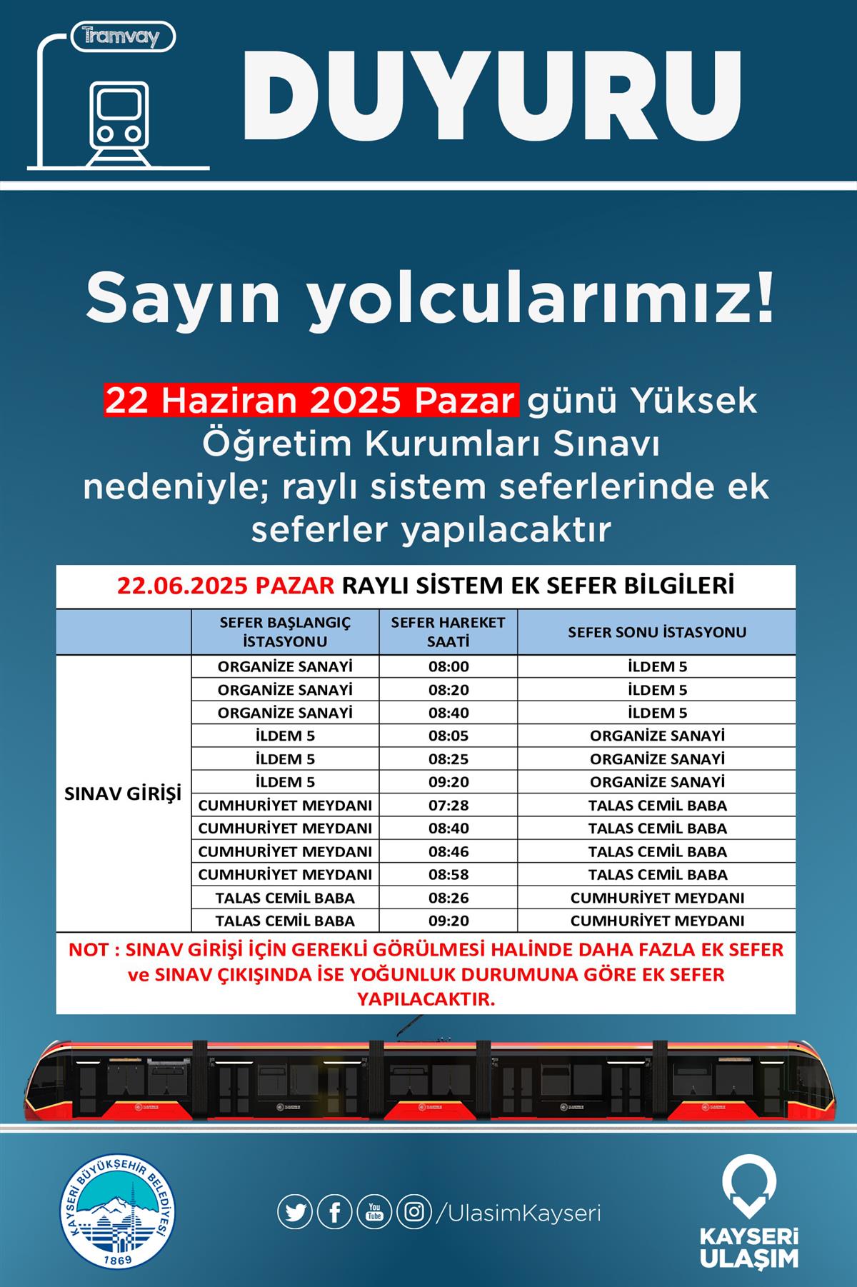 21 - 22 Haziran 2025 Cumartesi ve Pazar günü Yükseköğretim Kurumları Sınavı (YKS) nedeniyle raylı sistem seferlerinde ek seferler yapılacaktır