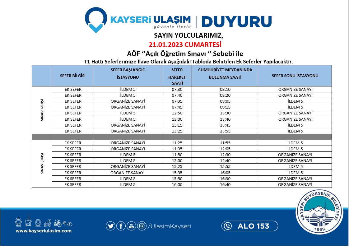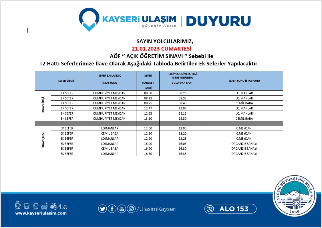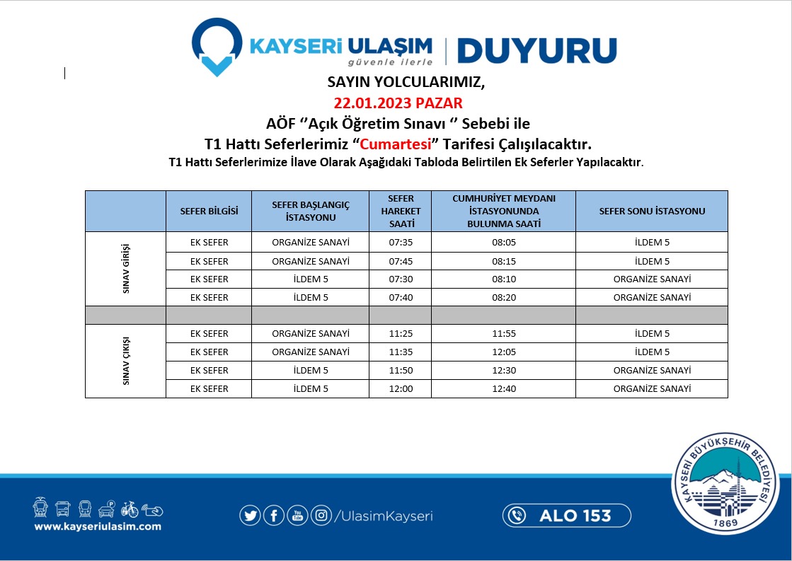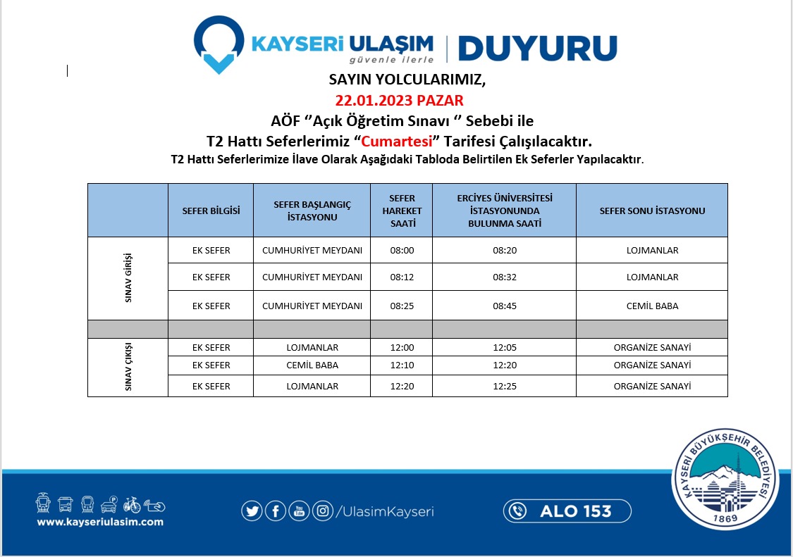 21-22.01.2023 Tarihinde Yapılacak AÖF (Açık Öğretim Sınavı ) Sınavı İçin T1-T2 Hatlarında Ek Seferler Tablodaki Gibidir.