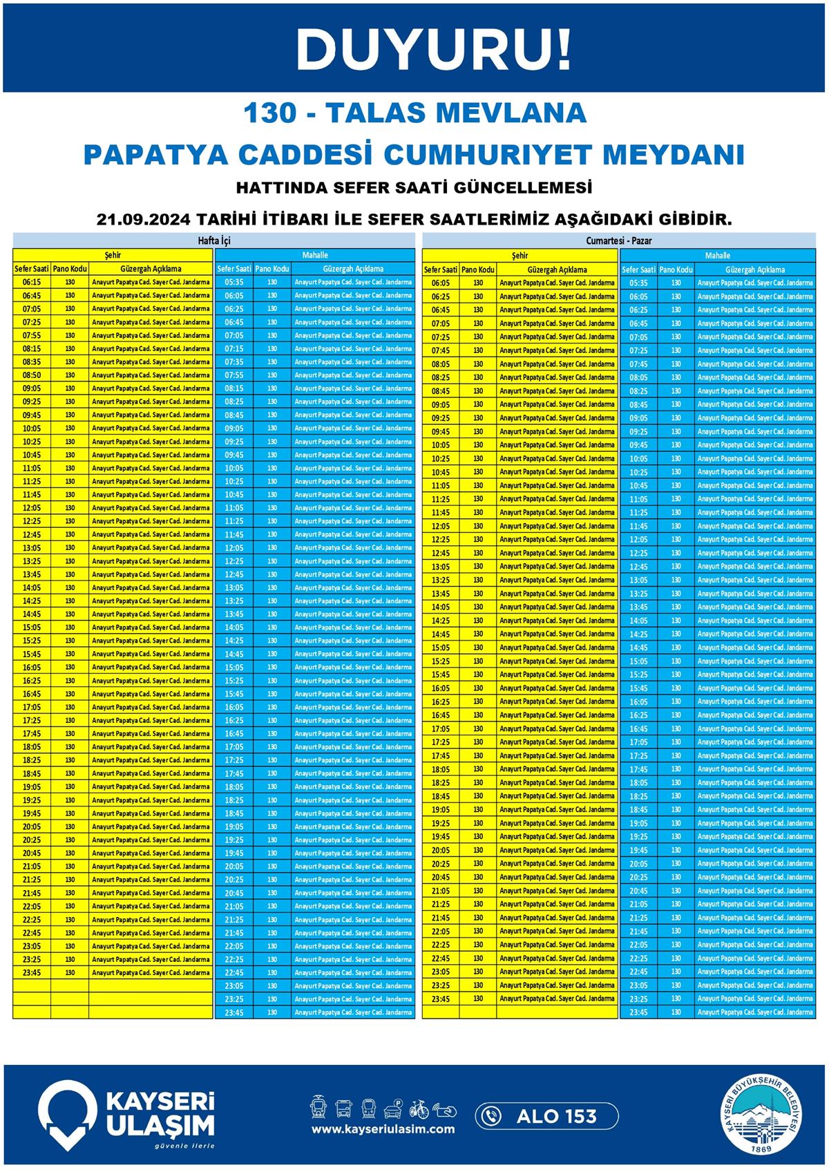 TALAS MEVLANA PAPATYA CADDESİ CUMHURIYET MEYDANI HATTINDA SEFER SAATİ GÜNCELLEMESİ