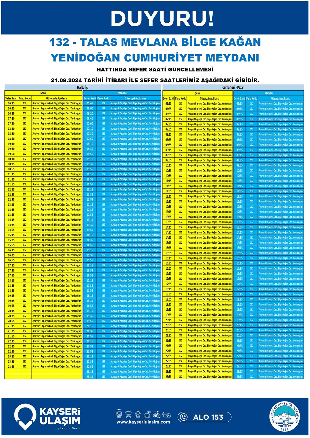 TALAS MEVLANA BİLGE KAĞAN YENİDOĞAN CUMHURİYET MEYDANI HATTINDA SEFER SAATİ GÜNCELLEMESİ