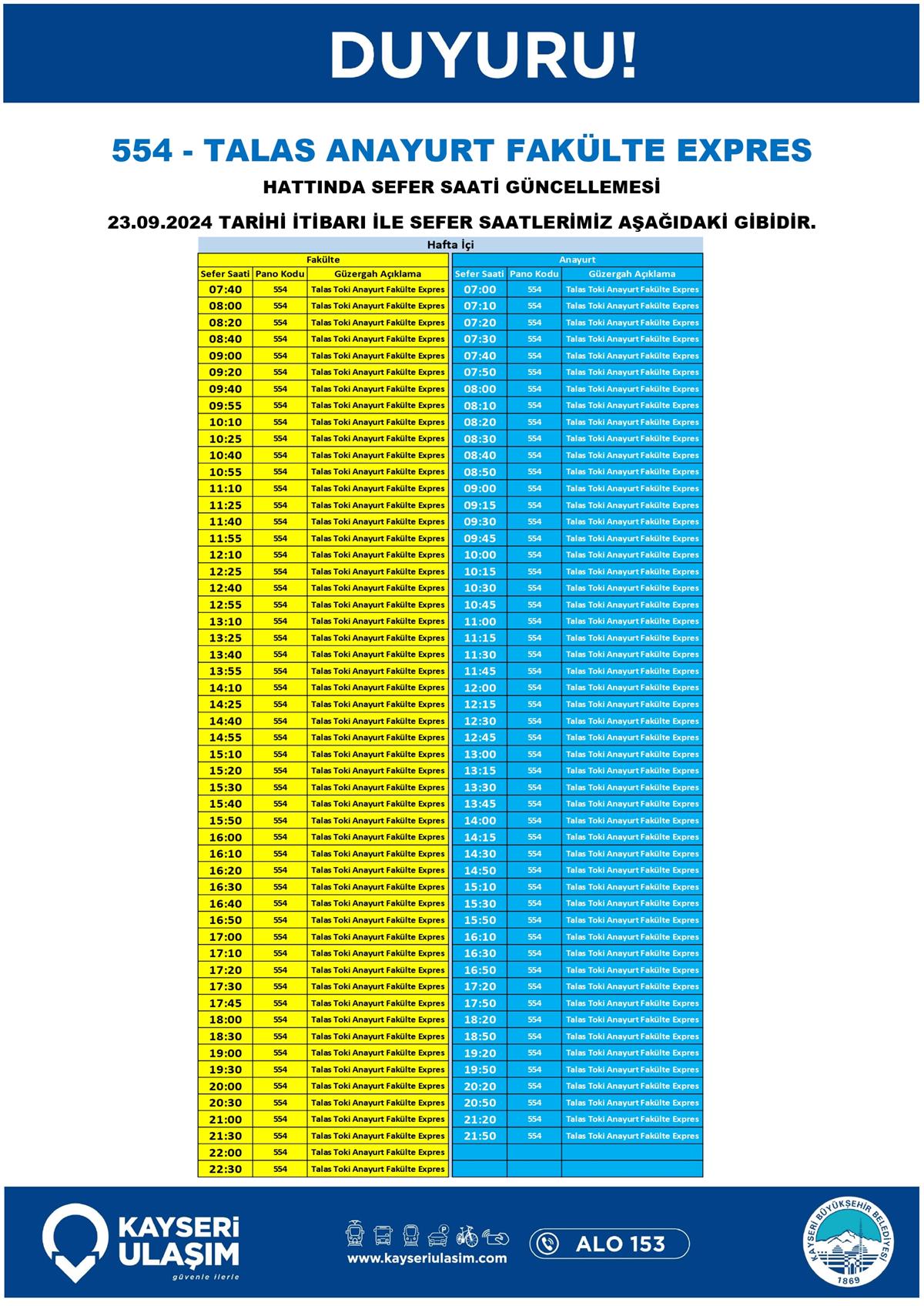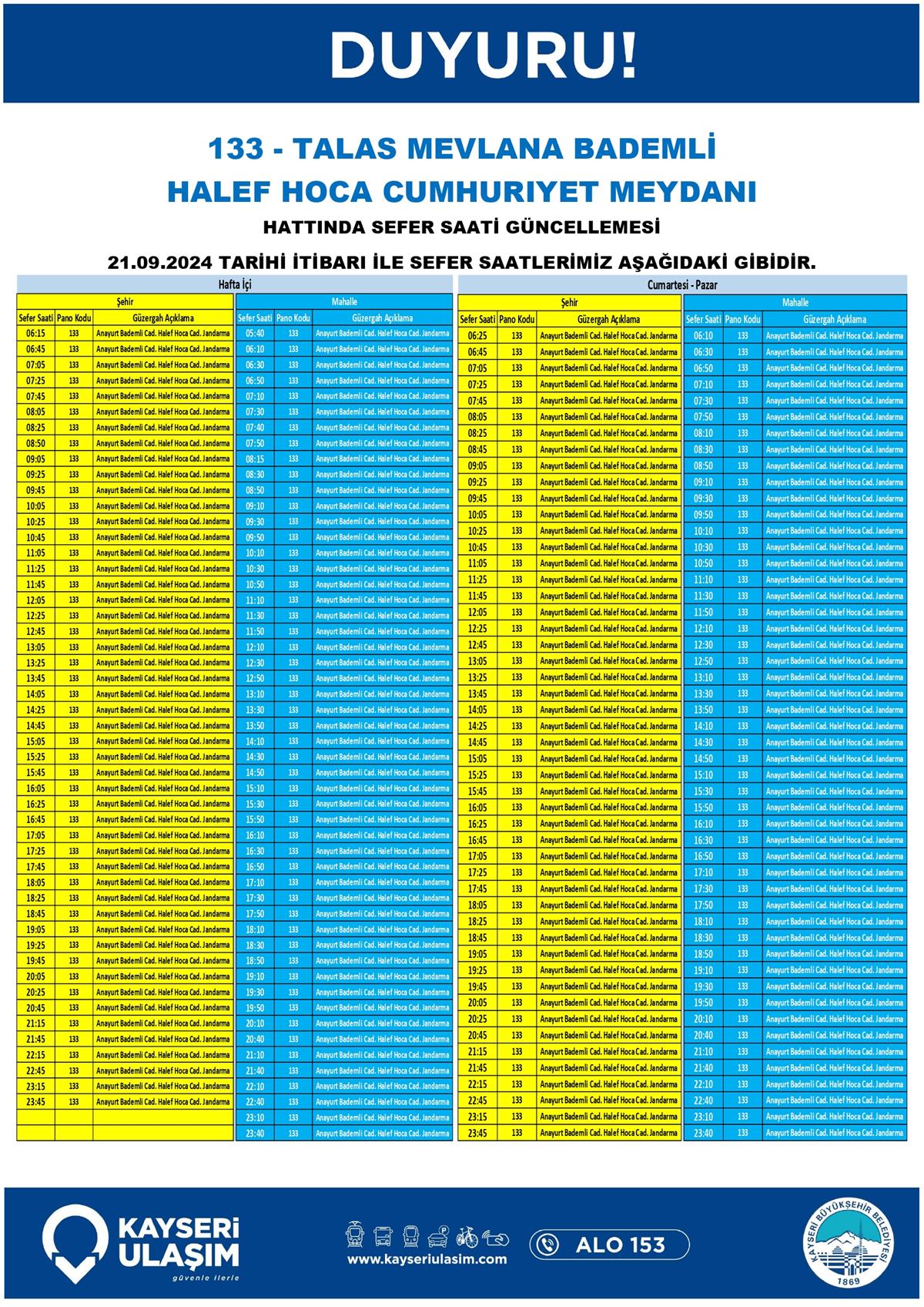 TALAS MEVLANA BADEMLİ HALEF HOCA CUMHURIYET MEYDANI HATTINDA SEFER SAATİ GÜNCELLEMESİ