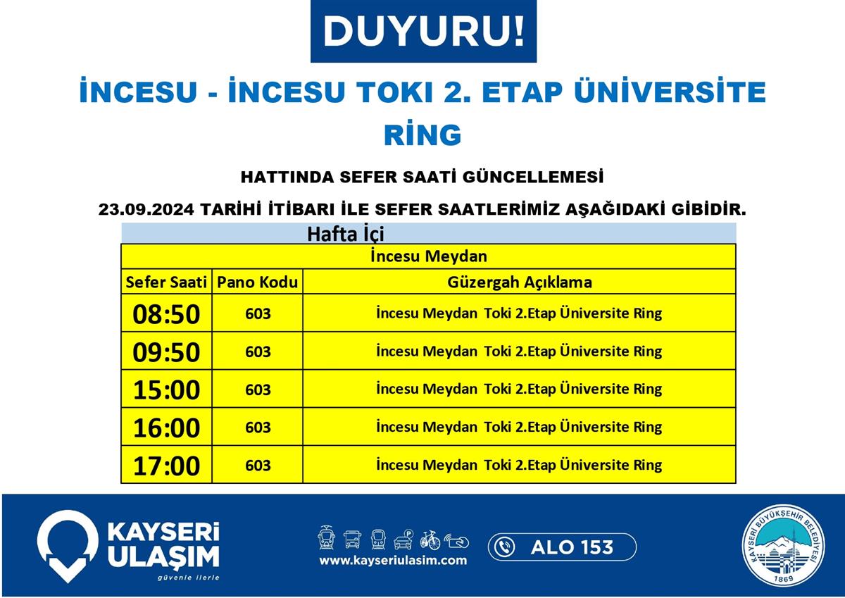 İNCESU - İNCESU TOKI 2. ETAP ÜNİVERSİTE RİNG HATTINDA SEFER SAATİ GÜNCELLEMESİ
