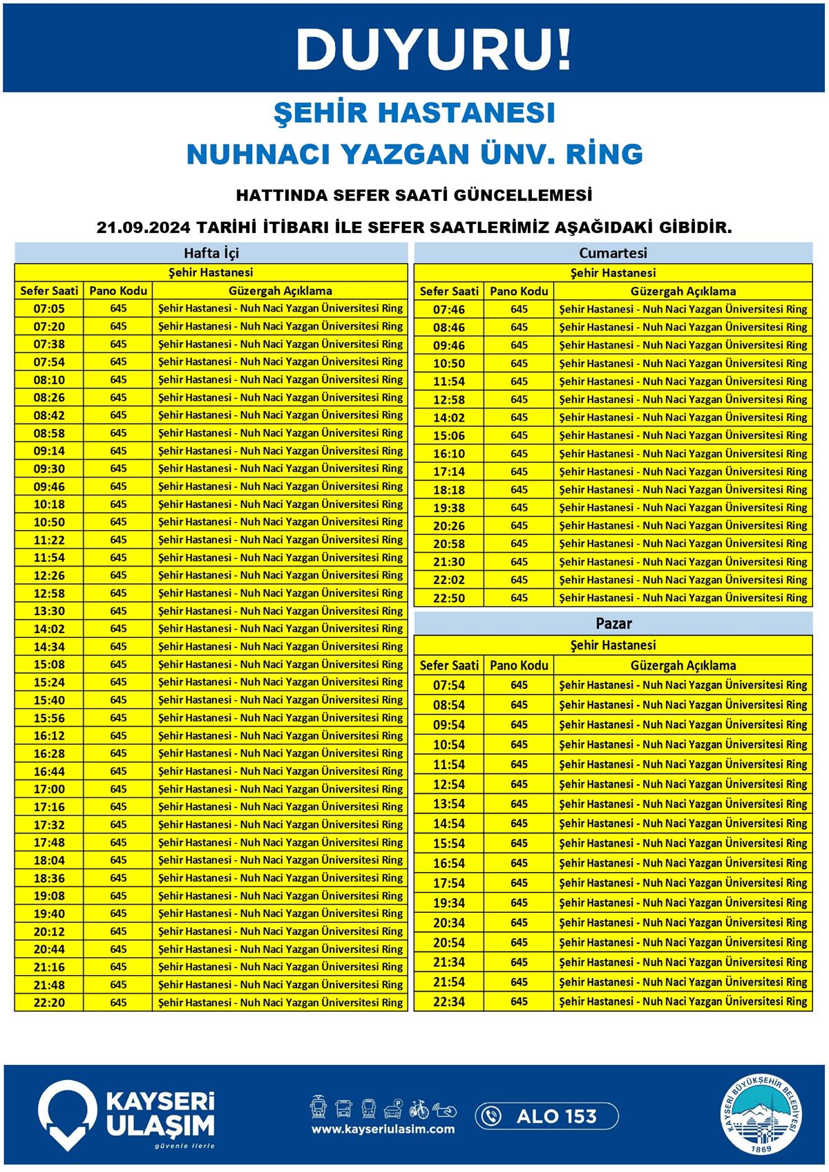 ŞEHİR HASTANESI NUHNACI YAZGAN ÜNV. RİNG HATTINDA SEFER SAATİ GÜNCELLEMESİ