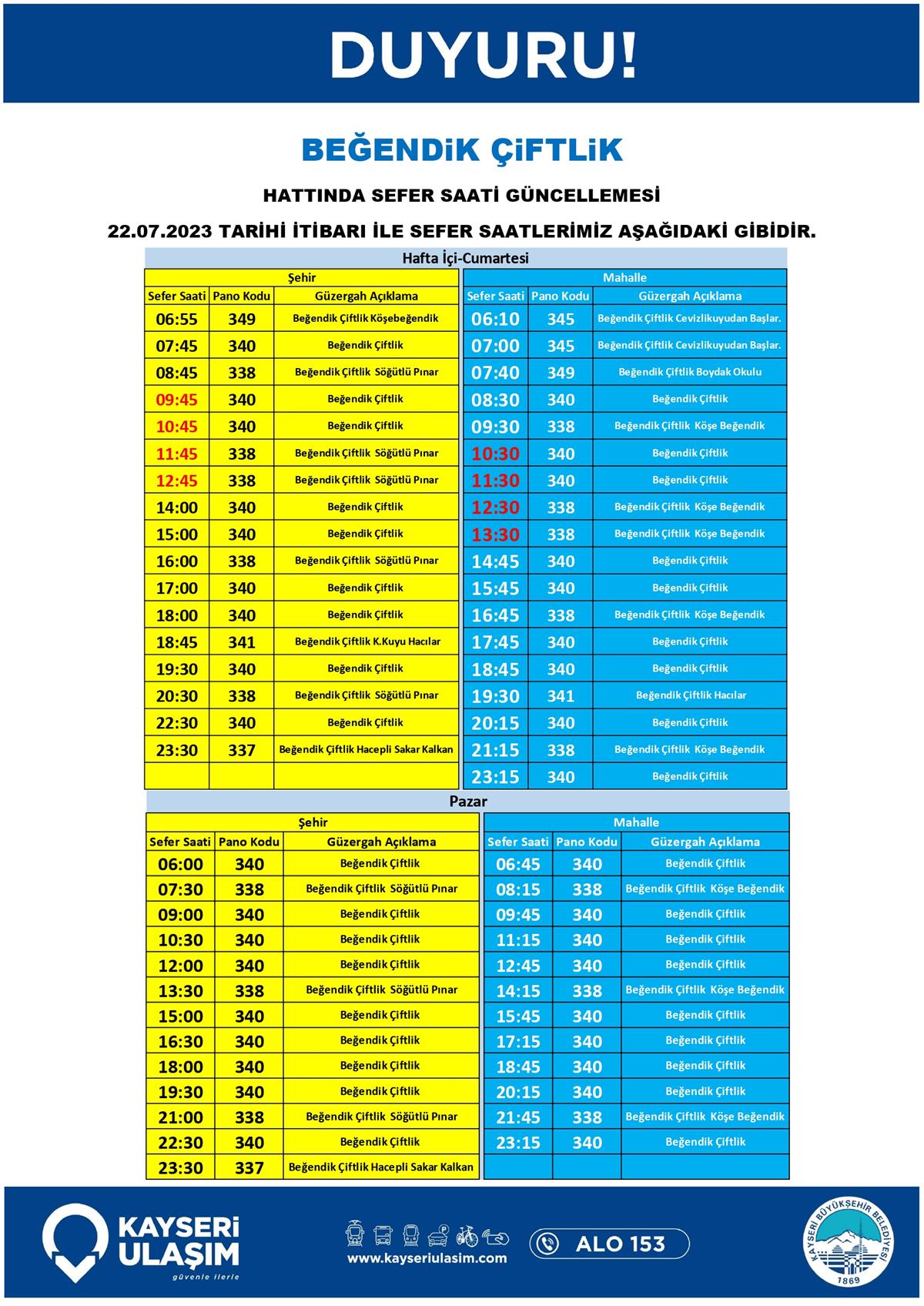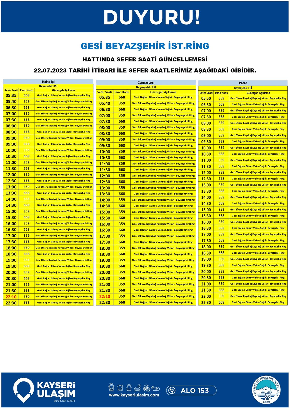 BEĞENDİK - ÇİFTLİK, DOĞU SANAYİ, GESİ BEYAZŞEHİR İSTASYONU RİNG, MOBİLYACILAR SİTESİ HATTINDA SEFER SAATİ GÜNCELLEMESİ