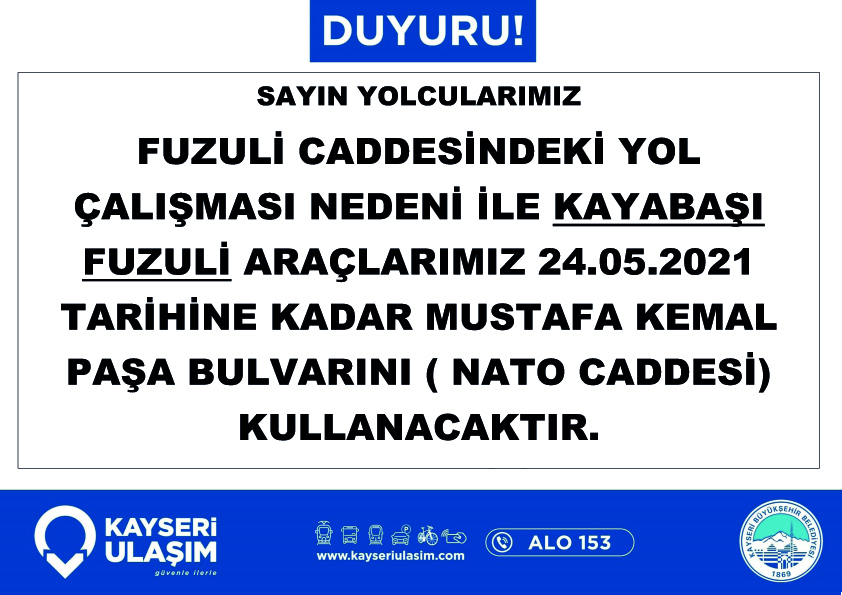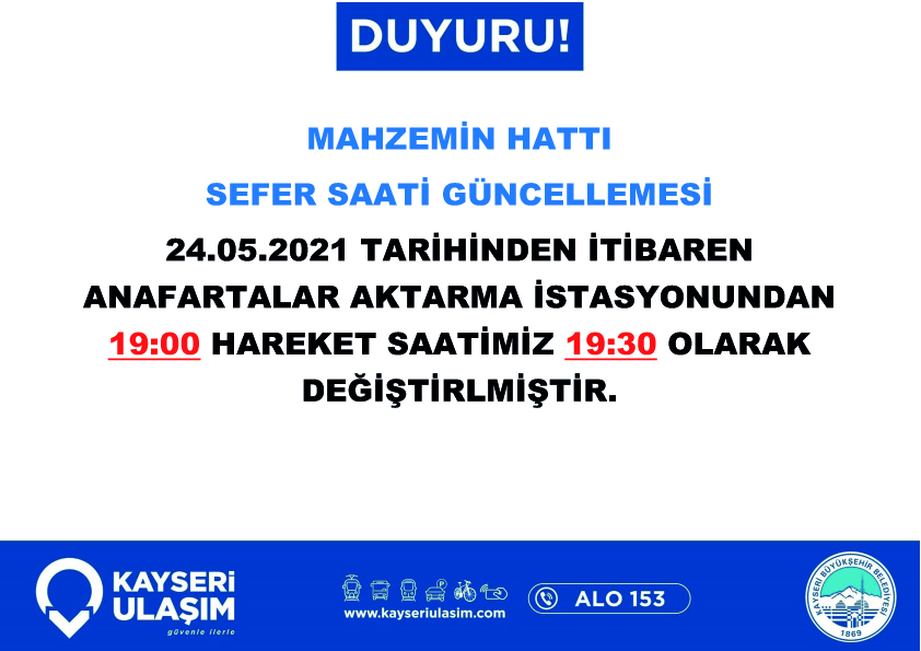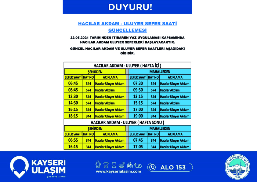 22.05.2021 Tarihinden itibaren geçerli olacak şekilde Hacılar Akdam – Uluyer otobüs hat ve/veya saatlerinde değişiklik yapılmıştır.
