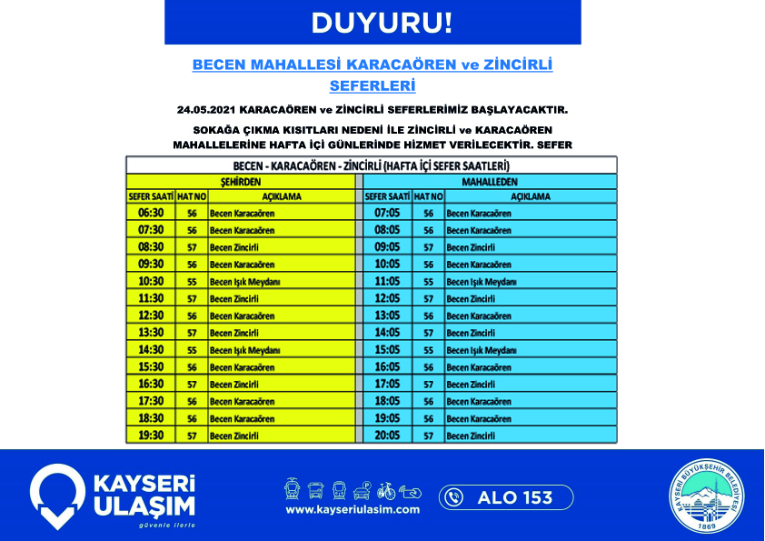 24.05.2021 Tarihinden itibaren geçerli olacak şekilde Mahzemin Hattı, Becen Mahallesi Karacaören, Zincirli ve Kayabaşı Fuzuli otobüs hat ve/veya saatlerinde değişiklik yapılmıştır.
