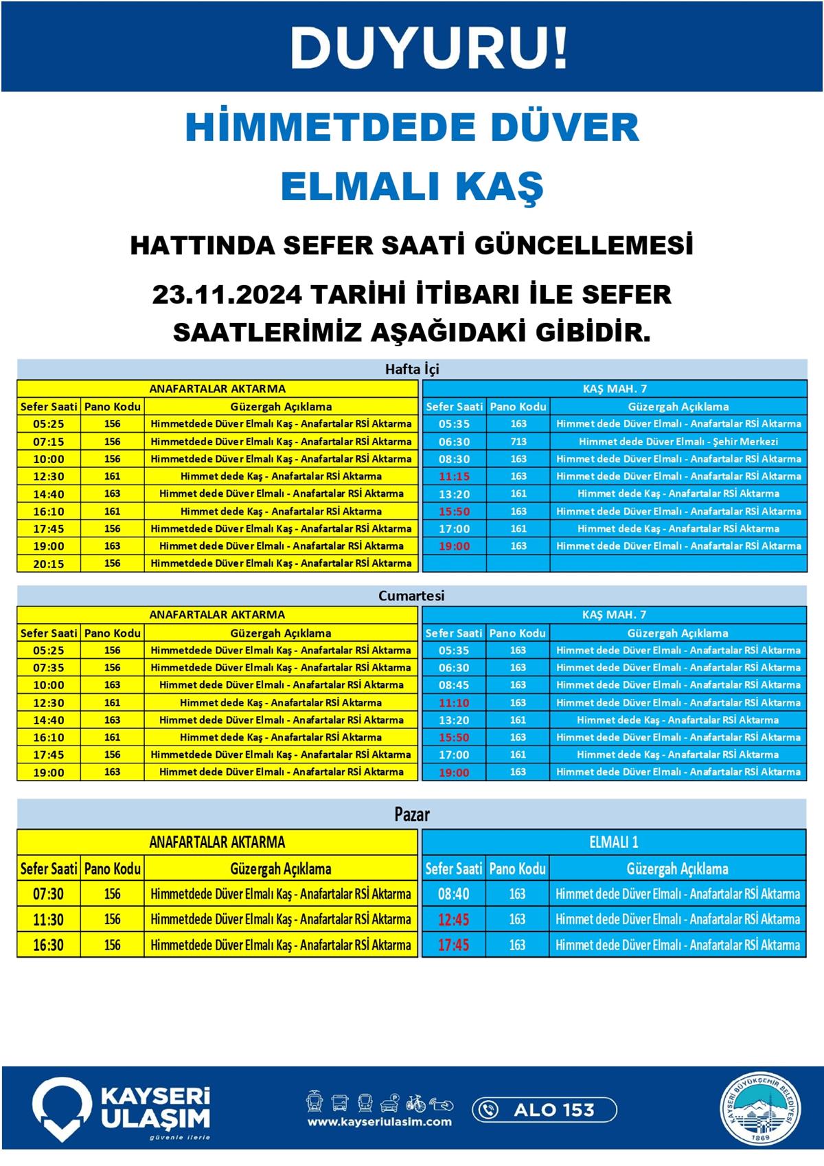 HİMMETDEDE DÜVER ELMALI KAŞ HATTINDA SEFER SAATİ GÜNCELLEMESİ
