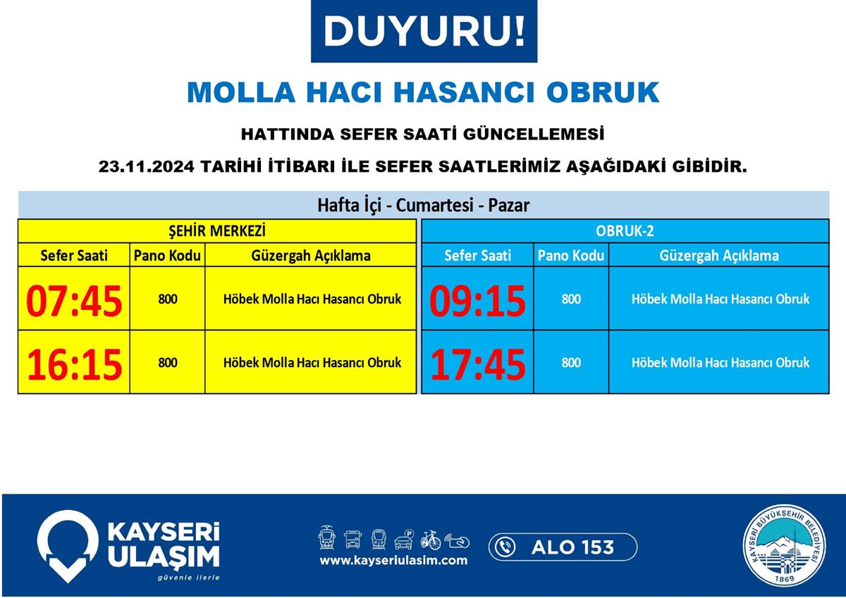 MOLLA HACI HASANCI OBRUK HATTINDA SEFER SAATİ GÜNCELLEMESİ