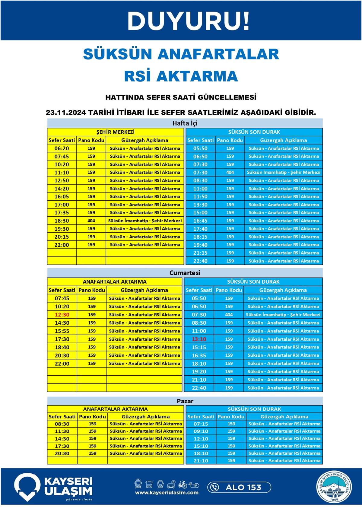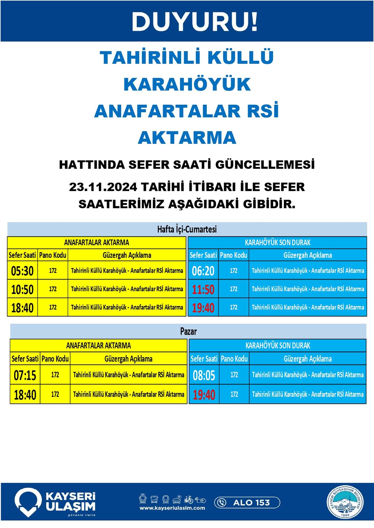 TAHİRİNLİ KÜLLÜ KARAHÖYÜK ANAFARTALAR RSİ AKTARMA HATTINDA SEFER SAATİ GÜNCELLEMESİ