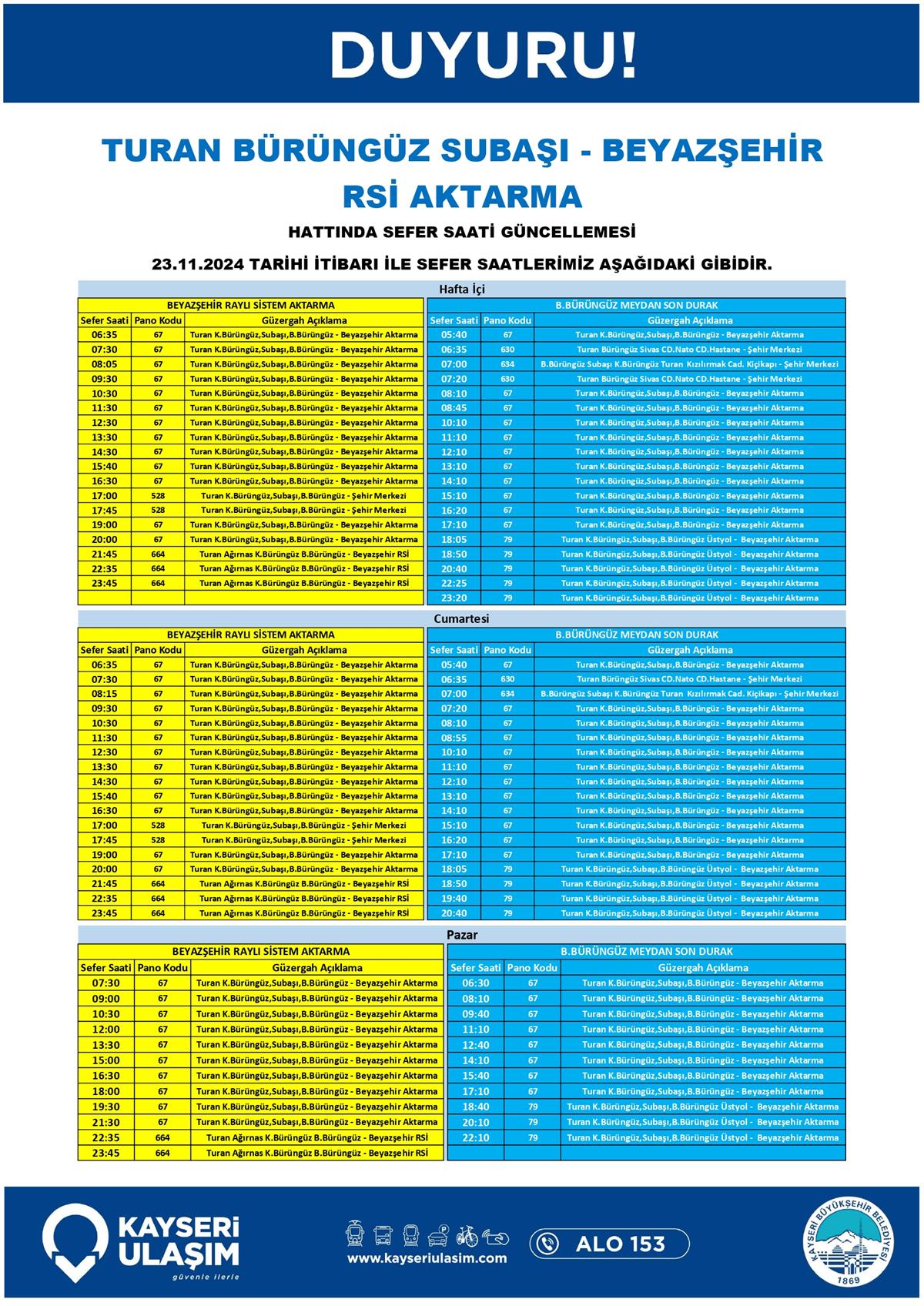 TURAN BÜRÜNGÜZ SUBAŞI - BEYAZŞEHİR RSİ AKTARMA HATTINDA SEFER SAATİ GÜNCELLEMESİ