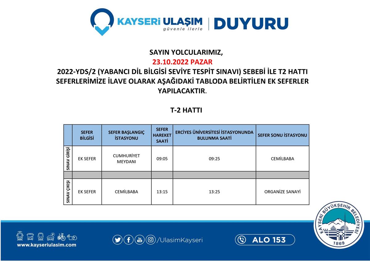 Sayın Yolcularımız; 23.10.2022 Pazar Günü uygulanacak T2 Hattı ek sefer bilgilerine duyurudan erişebilirsiniz. 2022-YDS/2 ( Yabancı Dil Bilgisi Seviye Tespit Sınavı ) Tüm Adaylara Başarılar Dileriz.